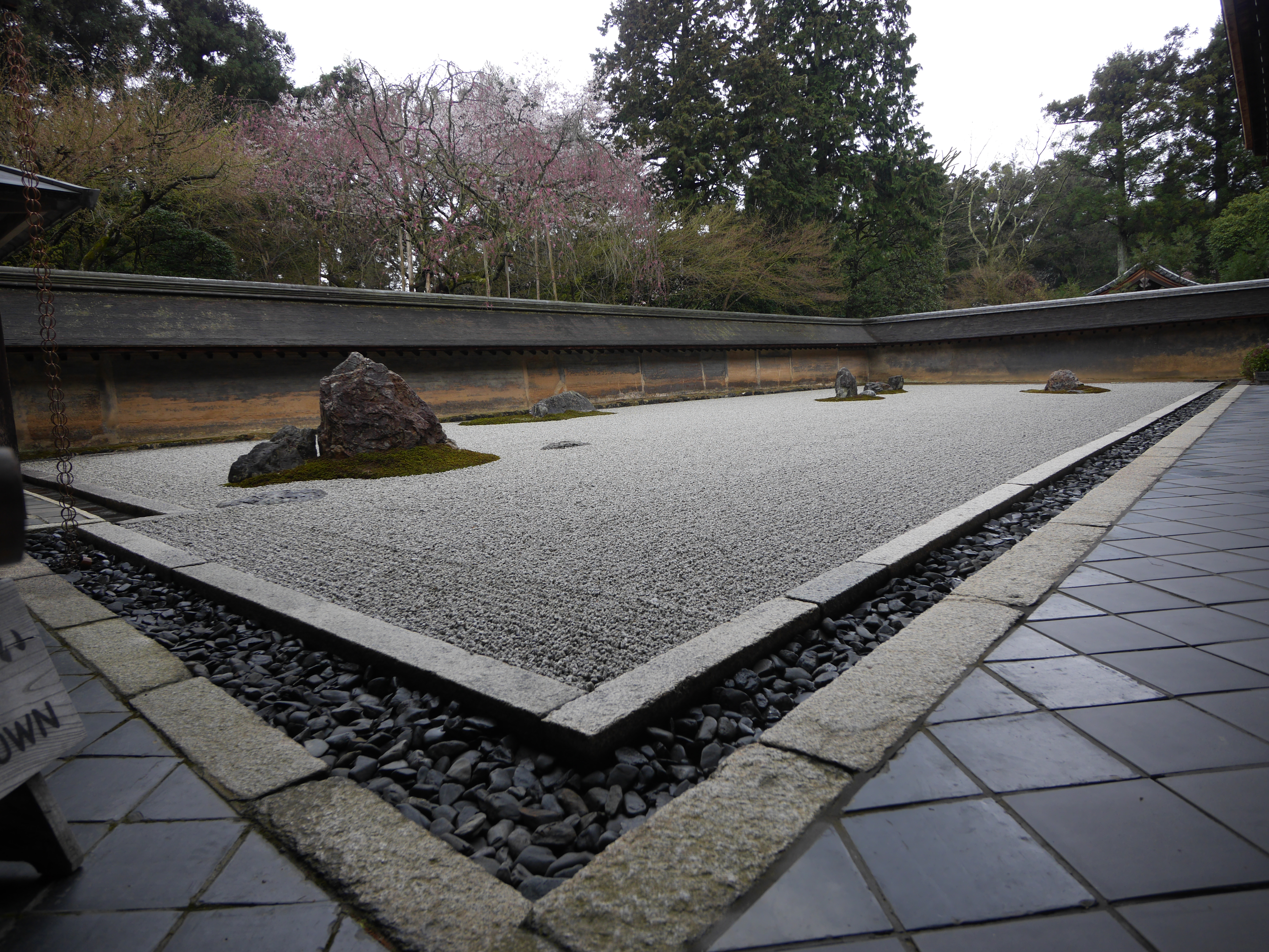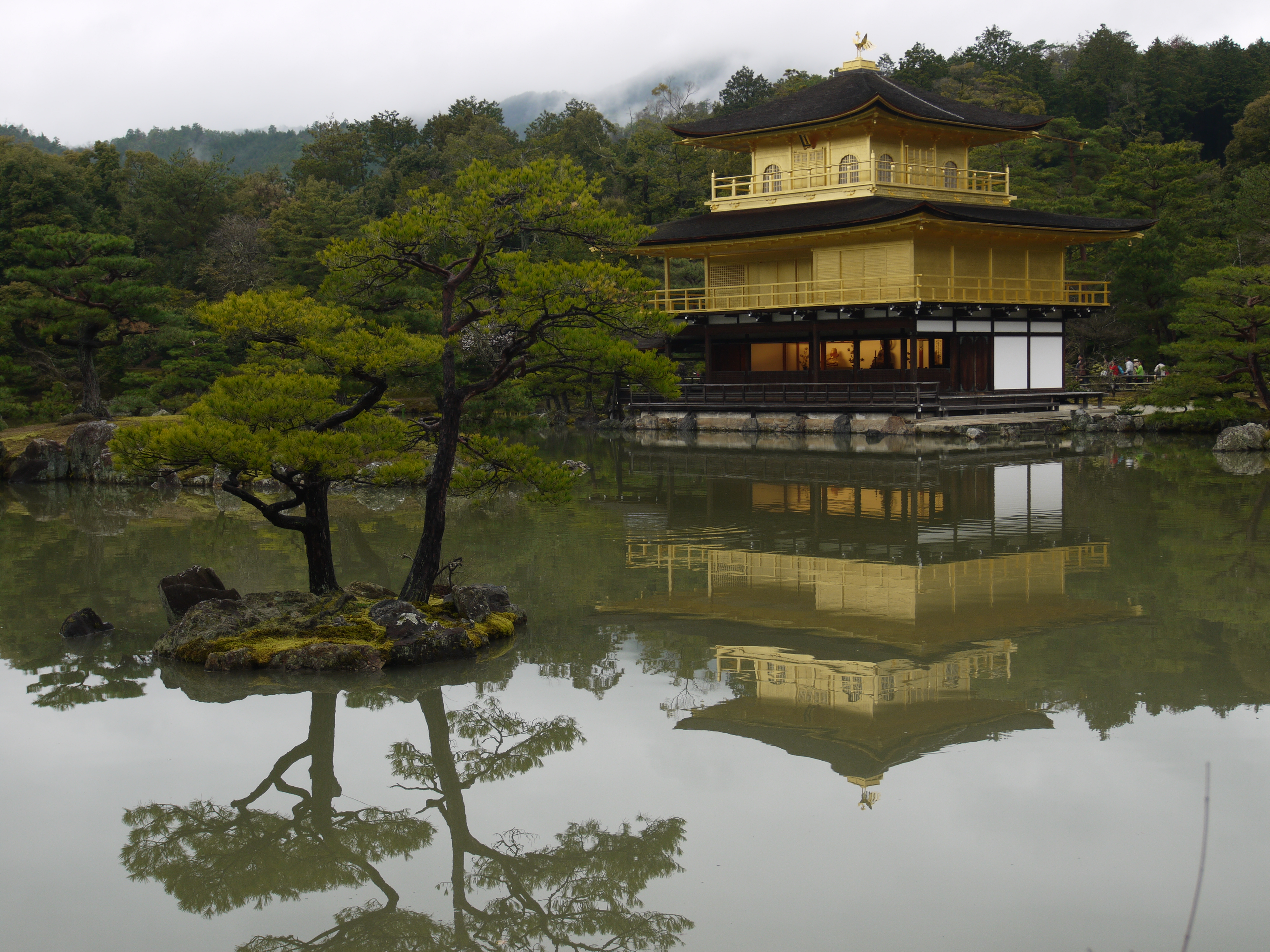 Unser erster Tempel ist der Kiyomizu Tempel. Es regnet in Strömen, aber wir geniessen den Anblick des hohen orangeroten Tempelbaus. Gestärkt mit einem japanischen Mittagessen können wir noch den berühmten goldenen Pavillon des Kinkakuji Tempels besichtigen. Der Pavillion mit dem See ist wunderbar angelegt und sehr schön. Viele der Schreine und Tempel wurden zu Unesco Weltkulturerbe ernannt. Zu so einem Weltkulturerbe gehört Ryoanji Tempel. Es regnet immer noch, aber wir unternehmen trotzdem die Tour zu dem riegelbauartigen Tempel mit dem Steingarten. Was sehr speziell ist, dass man beim Betreten die Schuhe ausziehen muss. In den Socken oder barfuss wird dann der meistens sehr karge Tempel besichtigt. Der Steingarten ist ein richtiger Zen-Garten. Eine grosse Kiesfläche, sorgsam geharkt mit klaren Linien, darin sind 5 kleine grüne Inseln auf denen die Steine angeordnet sind. 15 Steine, 15 ist im Zen eine ideale Zahl, sind so platziert, dass von jedem Standort, aus dem man das ganze betrachten kann, nie alle Steine zu sehen sind. Du musst den Garten aus mehreren Standpunkten betrachten, um ihn ganz zu erfassen. Ein wunderbarer Anblick zur Meditation…