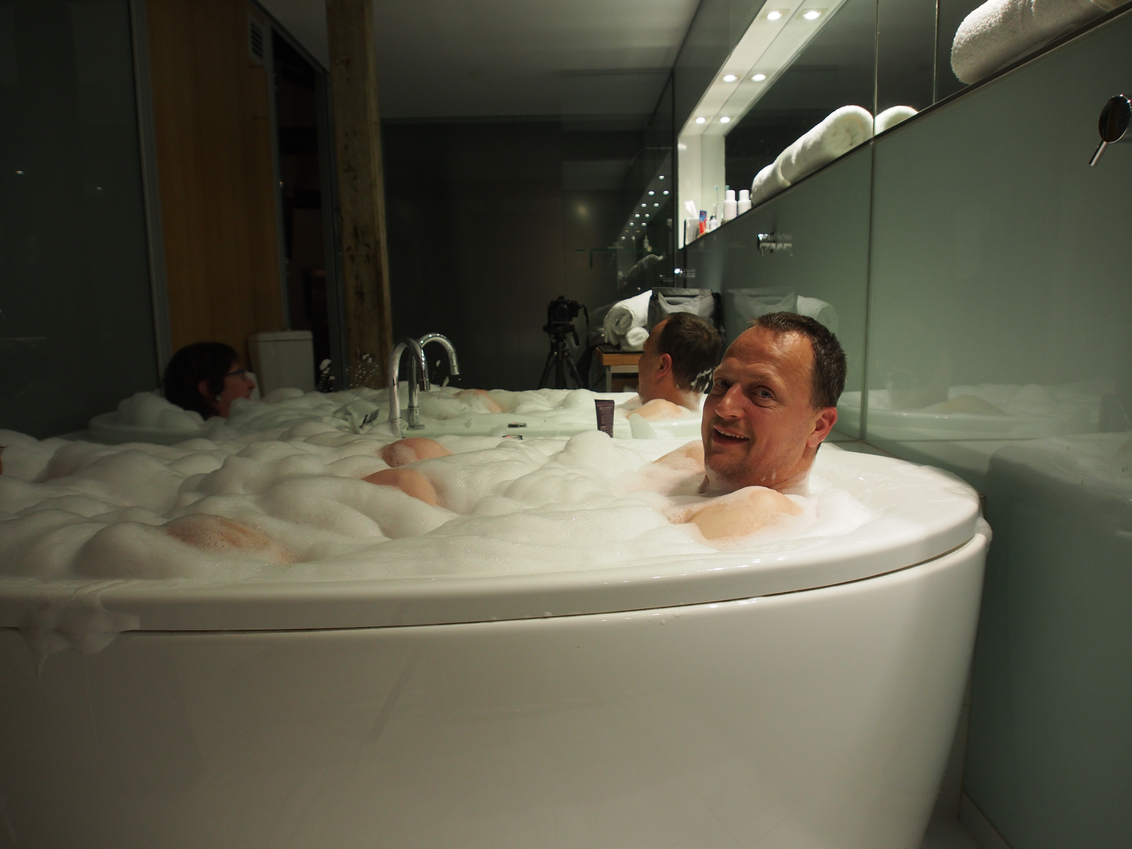 Im geräumigen Zimmer gibt es ein grosses Bad, in dem auch eine Sprudel-Badewanne steht. Wir haben uns entschieden, ein Bad in derselben zu geniessen. Also das Wasser füllen, bis es (zumindest mit uns beiden) über den Düsen steht. Da steht auch Badezusatz auf dem Rand, den geben wir dazu. Reingestiegen und dann auch den Whirl in Funktion gesetzt. Leider ist der Badezusatz wohl nicht der geeignete, bald sieht die Wanne aus wie ein Bierglas, das zu schnell gezapft wurde, der Schaum steigt deutlich über den Wannenrand. Wir fühlen uns wie Erdbeeren im Schlagrahm und wenn wir den Schaum in der Mitte ansammeln, können wir uns gar nicht mehr sehen. Als ich aussteige sehe ich aus, wie in Watte gehüllt.OLYMPUS DIGITAL CAMERA