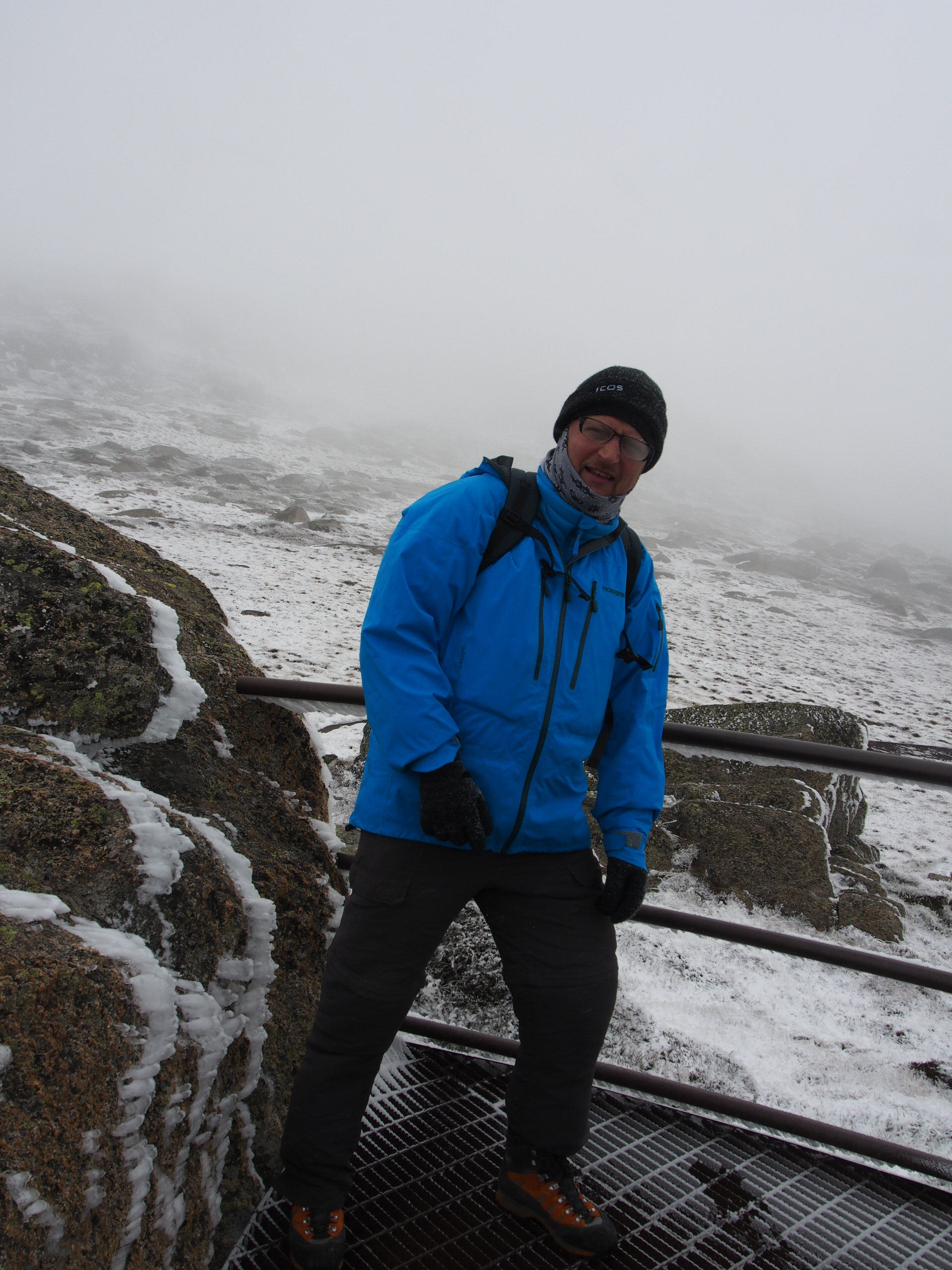 Wir haben den Berg nicht sehen können, er hat sich mit Wolken verhüllt. Die Landschaft ist mit eisigen Gebilden überzogen und selbst diese Stahlgitter des Weges sind stellenweise a###hglatt. Für uns stand spätestens da fest, dass es wohl keinen SInn hat, weiter zu gehen. Wir haben es aber versucht. Der Abstieg durch die Eukalyptuswälder, die hier bis auf knapp 1900m reichen (auch da gibt es eine Baumgrenze) war damit (fast) das Highlight des heutigen Tages. Die Bäume waren teilweise mit EIs ummantelt, trotzdem haben sie noch volles Laub, sie verlieren es nicht im Winter. Der Snow Gum ist eine speziell an solch harte Bedingungen angepasster Eukalyptus. Die ledrigen Blätter und  besondere Blattadern verhindern, dass diese durch die Kälte zerstört werden.