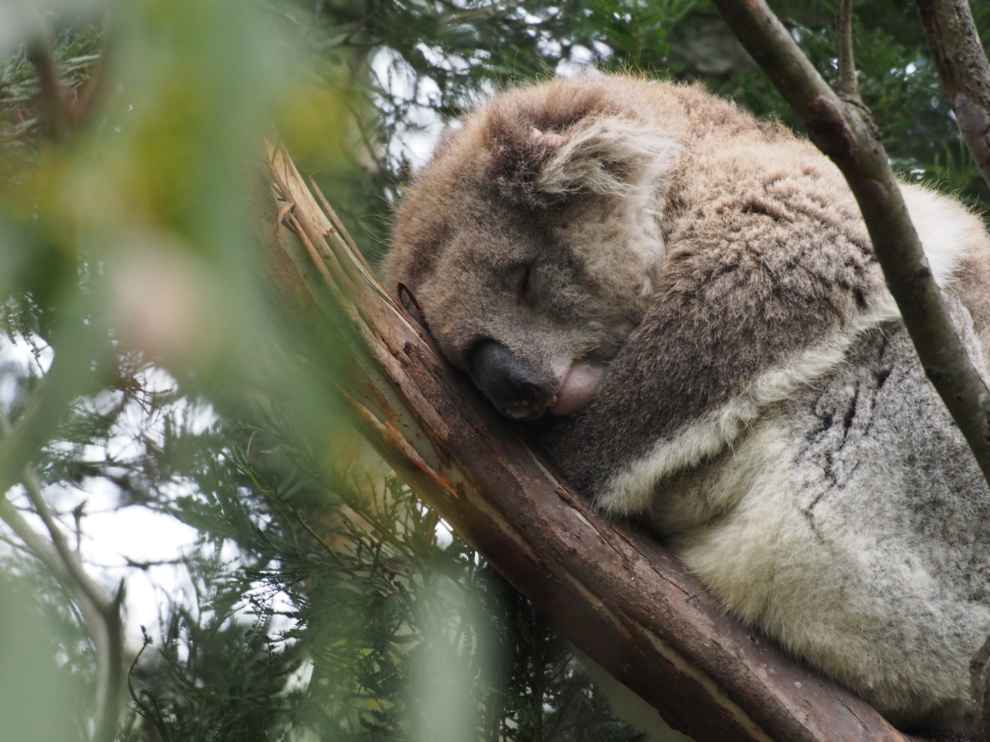 Zuerst machen wir einen Besuch bei der Koala Sanctuary. Die Koalas waren hier ursprünglich nicht heimisch. Durch Siedler wurden sie auf die Insel gebracht. In den letzten Jahren sind sehr unter Druck geraten, da viel Bäume abeholzt wurden und die Gebiete nicht mehr miteinander verbunden sind. In der Sanctuary leben die Tier auf einem begrenzent Gebiet sehr natürlich. Die schlafenden Gesellen sind gut in den Baumgabeln auszumachen. Es ist einfach ein toller Anblick.
