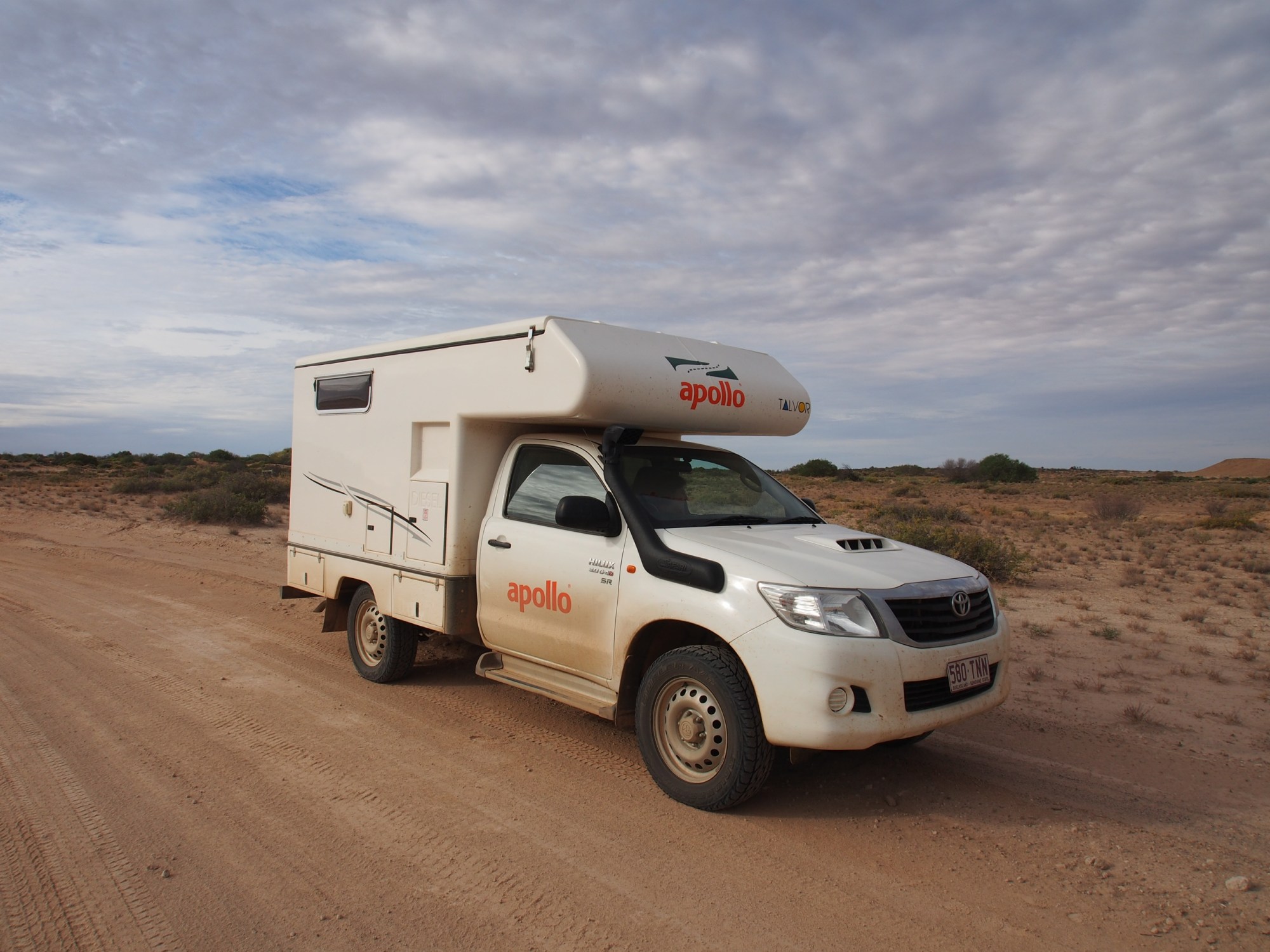 Wir haben uns die letzten Tage mit so einer Puncture herumgeschlagen. Angefangen hat es mit einem leisen Verdacht. Ungefähr 100km von der letzten Servicestation entfernt und mit dem Ziel auf einem Campground in einem Nationalpark kommt erscheint uns der eine Reifen etwas wenig Luft zu haben. Nachdem er auch nach einem Walk von 10-15 Minuten gleich aussieht, entscheiden wir uns noch weiterzufahren und den Reifen zu beobachten. Nach weiteren 20km: Sichtkontrolle (ist er flacher? wenn, nur wenig) und Fühlkontrolle (er ist deutlich wärmer als der andere) und Entschluss, einen Radwechsel vorzunehmen. Ich habe den Wagen noch nicht aufgebockt, hält ein anderer Fahrer an und bietet Hilfe an. Er hat eine Pumpe dabei und pumpt uns den Reifen auf denselben Druck, wie gegenüber auf.