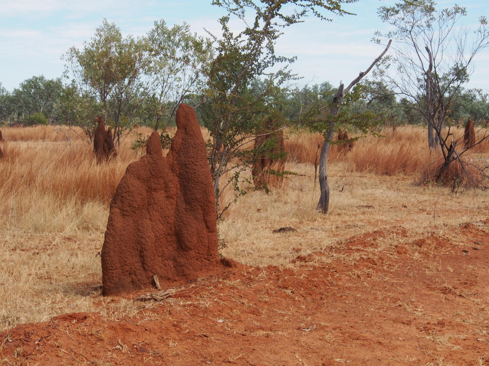 Hier im Northern Territory gibt es recht viele Termiten. Es gibt Gegenden, wo es mehr Termitenbauten gibt als Bäume. In der Nähe von Top Springs stehen sie beidseitig an der Strasse so weit das Auge reicht und machen mit der roten Farbe den Eindruck, als stünde hier eine andere Terrakotta-Armee auf den Feldern. Es gibt schlanke Türme aber auch mächtige, breite. Viele gleichen Statuen wie wir sie in Kirchen sehen, wenn der Sandstein schon arg verwittert ist. Diese hier macht auf mich den Eindruck, als ob 3 Generationen da stehen und sitzen: in der Mitte eine eher ältere Frau die sitzt, rechts eine jüngere Person stehend mit einem Kind im Arm und links ein Kind, das sitzt oder krabbelt.