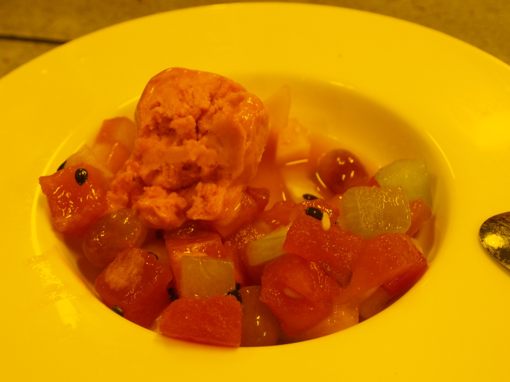 Die Erklärung: Leider ist das Apfelsorbet heute nicht vorrätig, darum gibt es ein Wassermelonen-Sorbet. Leider wurde bei der Bestellung vergessen, darauf hinzuweisen. Dass auch kein Coulis von Passionsfrucht darunter ist, kann ich erst hinterher sehen.