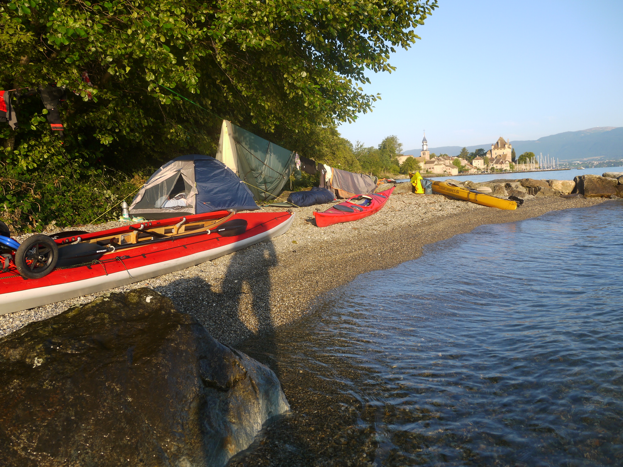 Frühmorgens hat es dort zu regnen begonnen, eigentlich mehr Schauer. Immer wieder ging ein leichter Schauer nieder, weswegen wir die Zelte nass einpacken mussten. Dafür war es nicht mehr so heiss zum Paddeln. Etwa um 10 Uhr starteten wir, gelangten bis zum Mittag nach Hermence an der Grenze zu Frankreich, wo wir noch ein Picknick zu uns nahmen, bevor wir weiter fuhren. In Nernier bummelten wir ein bisschen durch das Städtchen, tranken Kaffee und genossen ein Zvieri. Weiter ging es nach Yvoire mit seinem markanten Schloss. Hier suchten wir ein Plätzchen zum wild campieren. Schliesslich fanden wir einen kleinen Kiesstrand, etwas erhöht und nicht allzu weit von der Altstadt entfernt, auf dem wir alle Platz zum Schlafen fanden. Wir bauten unser Zelt auf, Mättu schlief ohne Zelt am Strand und Peter in der Hängematte in den Bäumen. In der Stadt haben wir ein feines Nachtessen genossen bevor wir wieder zu Fuss zu unserem Camp zurückgegangen sind.