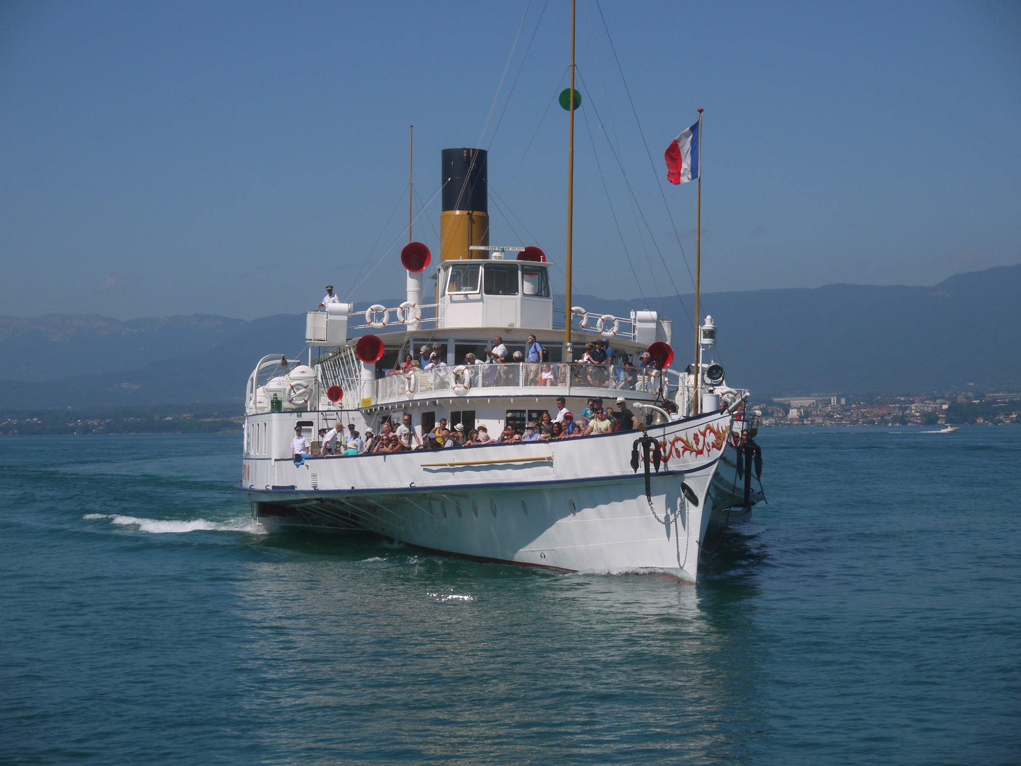 In Yvoire haben wir das Faltboot wieder in seine Taschen verpackt und den Rest des Gepäcks (Schwimmwesten, Schlafsack, Zelt, Isoliermatte, Reservewäsche und all die anderen kleinen Dinge) mit den beiden Taschen auf unseren Bootskarren gezurrt. Um die Mittagszeit fährt von dort ein Schaufelraddampfer nach Lausanne-Ouchy.