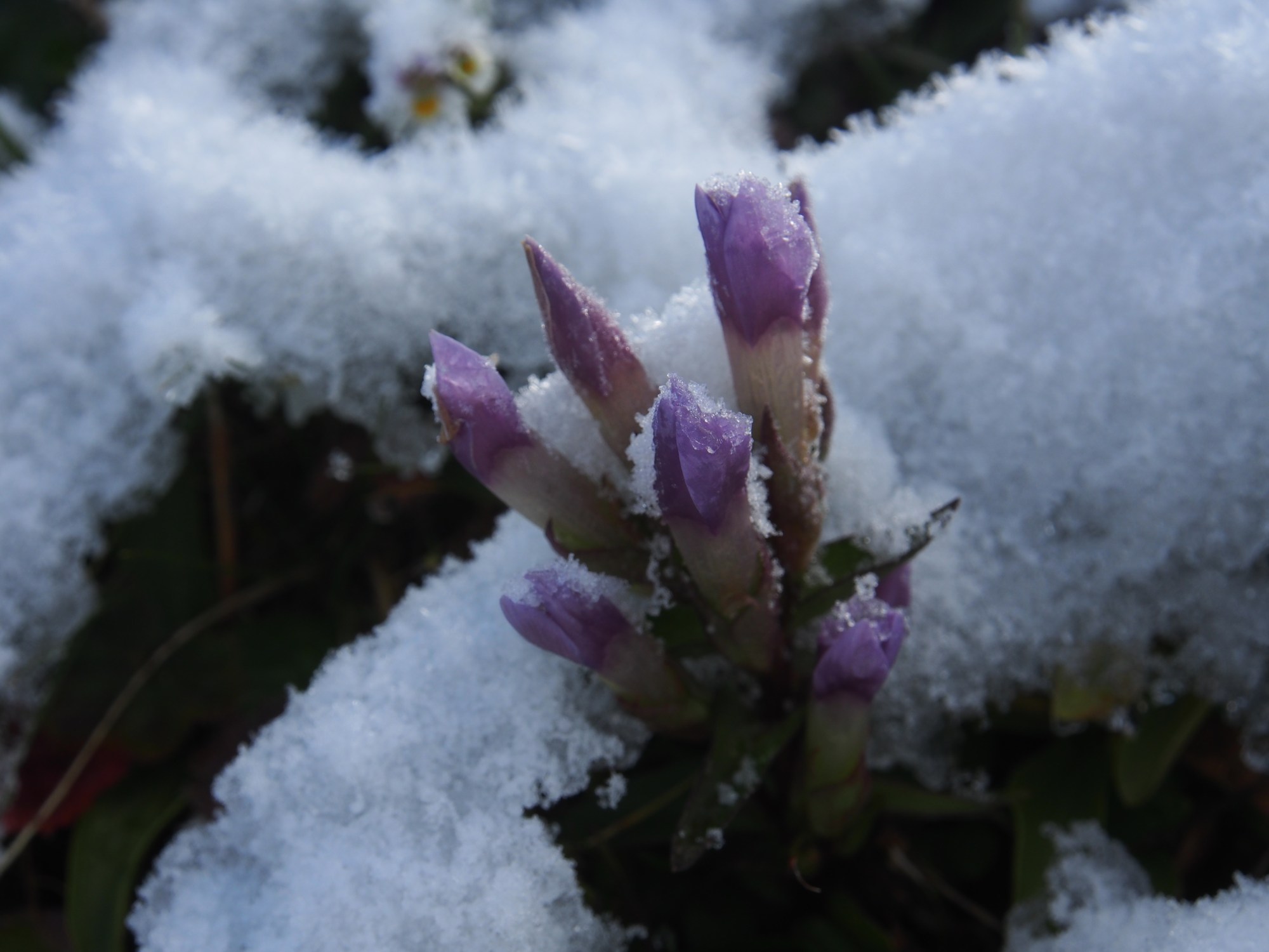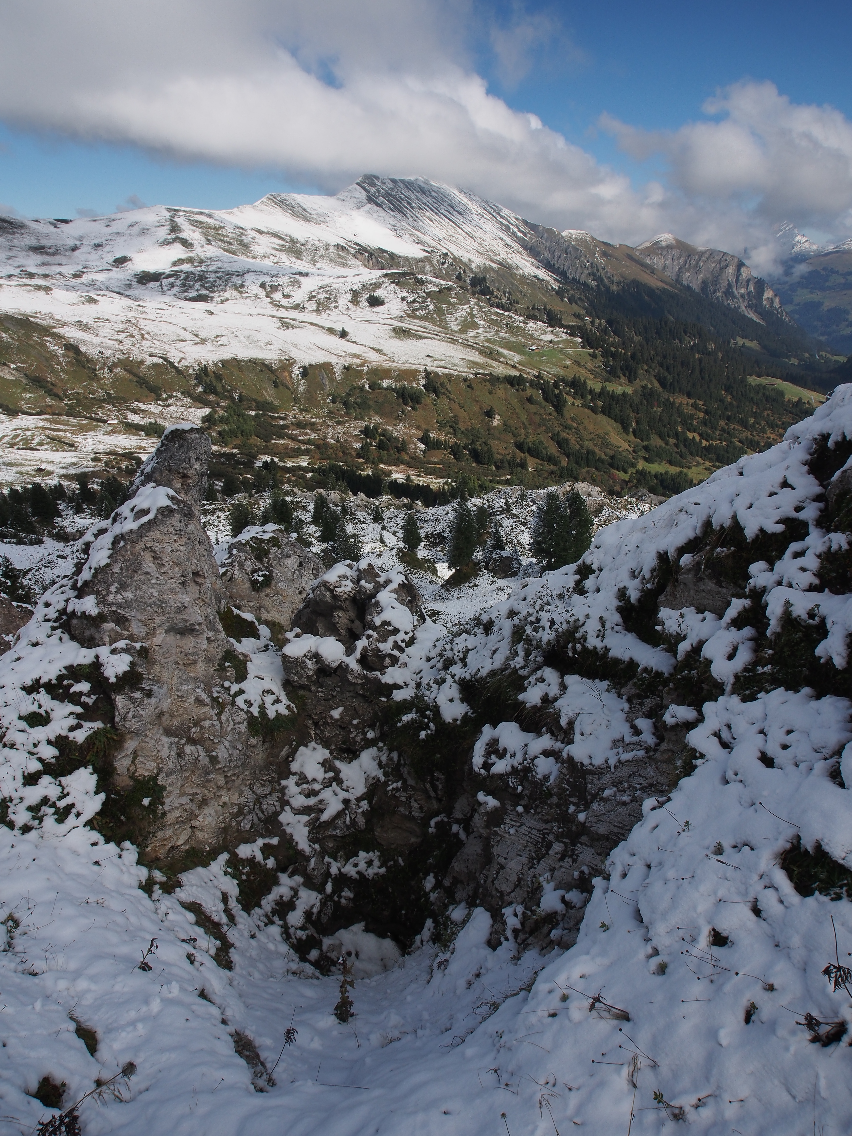 Nachdem es gestern hier auf 1000m Höhe noch geregnet hat (in der Höhe hat es geschneit) beginnt der Tag heute zwar sehr kühl aber recht sonnig. Nebel hängt teilweise an den Hängen, besonders auf der Ostseite des Tals. Wir fahren auf der Westseite mit einer Gondel in die Höhe. Auf 1950m Höhe liegen einige cm Schnee, die Landschaft ist angezuckert. Wir wollen trotzdem ein bisschen marschieren und gehen weiter westwärts. Es geht erst einigermassen flach auf einem Kiesweg. Später ist der Weg allerdings nicht mehr gekiest und entsprechend klebrig und rutschig. Nach kurzer Zeit haben die Hosenbeine die Farbe der Erde hier angenommen. Die Landschaft verzaubert mit ihrem leichten, weissen Kleid. Kleine Weiher sind grösstenteils mit einer dünnen Eisschicht bedeckt. Dolinen geben dem Gipfel hier den Namen, die kleinen Geländekammern sind eben Stübleni für die Talbewohner. Und so heisst der Gipfel, den wir nach etwas mehr als einer Stunde erreichen, Stübleni (2109m). Der Gipfel ist sehr zerklüftet, das gipshaltige Gestein wird von Wasser leicht gelöst und so bilden sich darin die Dolinen, kraterförmige Vertiefungen.