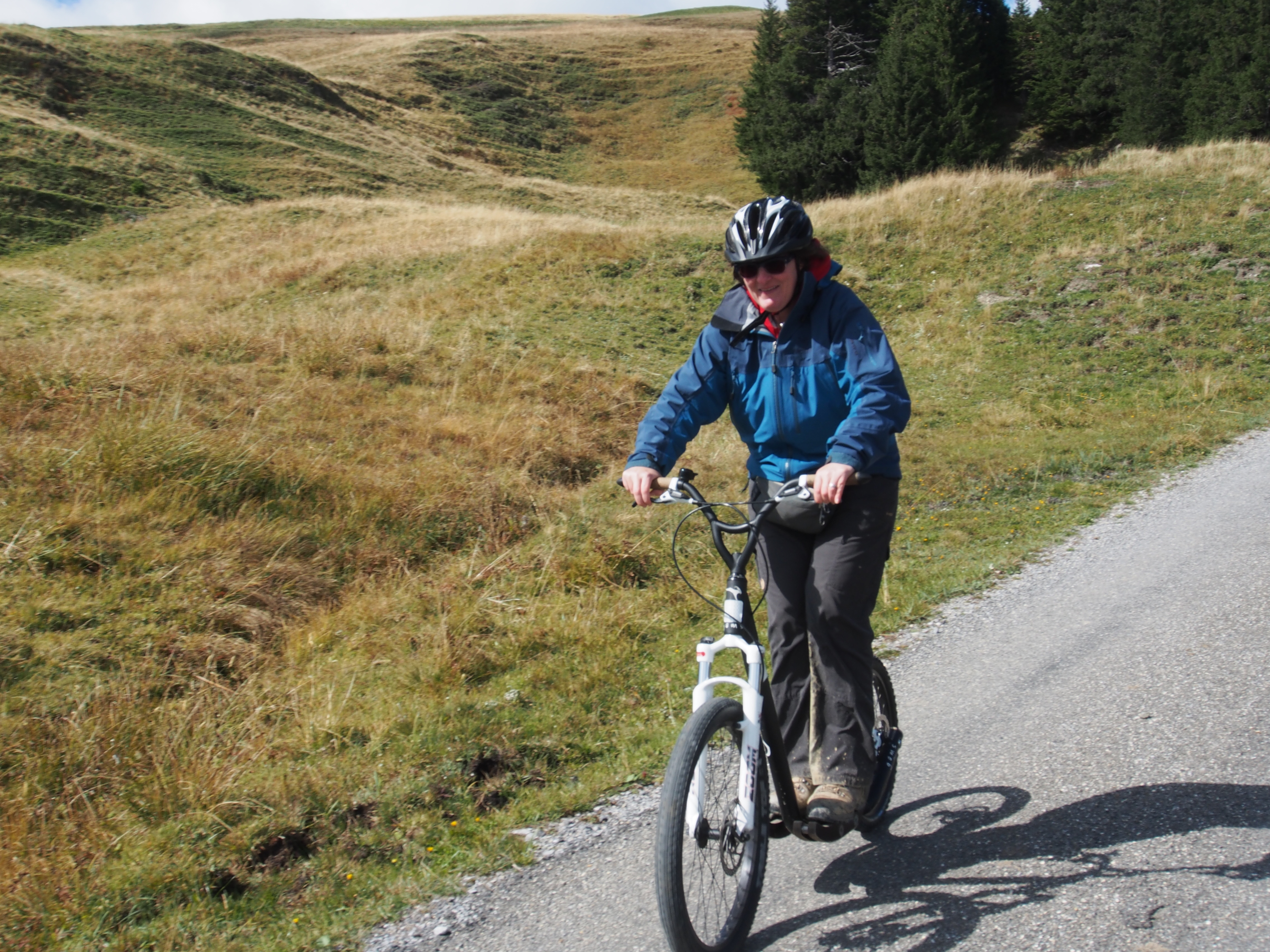 Die relativ grossen Vorderräder mit Scheibenbremsen (auch hinten), ein Rahmen, der eigentlich nur ein Bügel aus einem kräftigen Metallrohr ist und eine Standfläche, auf der man bequem mit beiden Füssen stehen kann machen das Gefährt auch auf Alpwegen sicher zu fahren. Allerdings steht man so hoch, dass es nicht so leicht ist, auf ebener Fläche Schub zu geben, aber zum Glück geht es meist abwärts und die Bremse ist stark gefordert. Wir gelangen letztlich gut zur Talstation der Gondelbahn, wo wir das „Trottinet“ wieder zurückgeben.