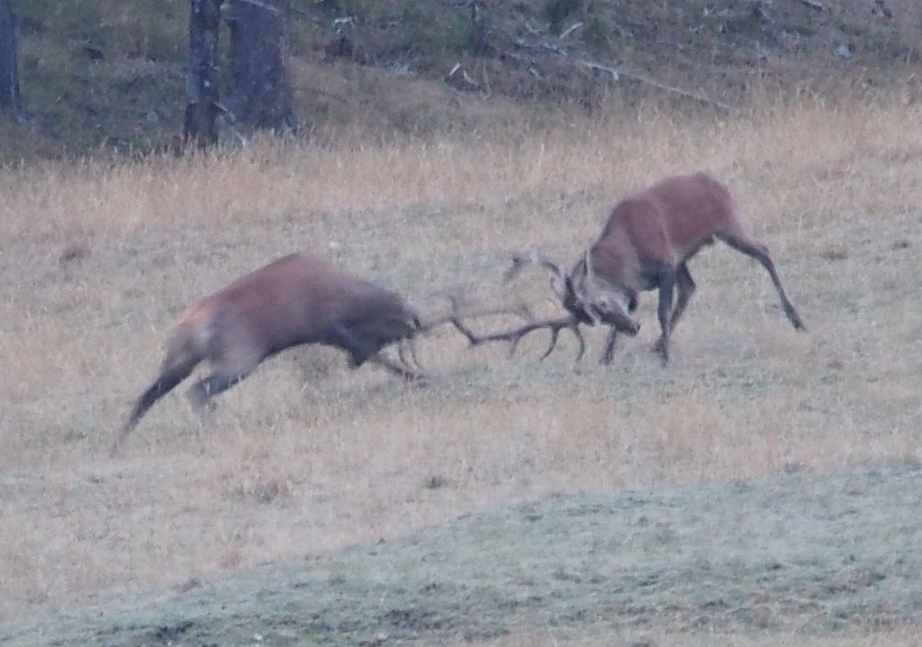 Zum dritten haben sie jetzt auch die intensive Zeit der Brunft und führen die ganz grosse Röhre; und ich vermute, dass es nicht nur die einheimischen sind. Egal wo man geht und steht röhrt es aus den Wäldern, und das den ganzen Tag. Prächtige Stiere buhlen um die Gunst der Kühe und messen sich untereinander. Vor unserer Unterkunft kann man immer wieder solchen Kämpfen zusehen.