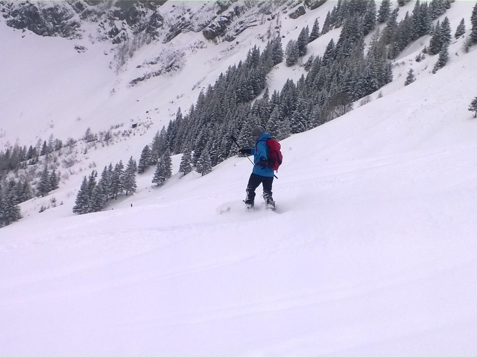 Nach gut 2 Stunden erreichen wir den Grat. Wir verpflegen uns und warten einige Minuten, bis die Sicht wieder etwas aufklart. Das Heidekraut steigt mit Andreas mit den Schneeschuhen ab und ich fixiere das Board. Die Schwünge sind anfänglich etwas schwierig, aber nach einigen gelungenen Bogen werde ich mutiger. In mässig steilem Gelände geht es dann ganz gut. Ich bin letztlich angenehm überrascht, wie gut es abwärts geht.