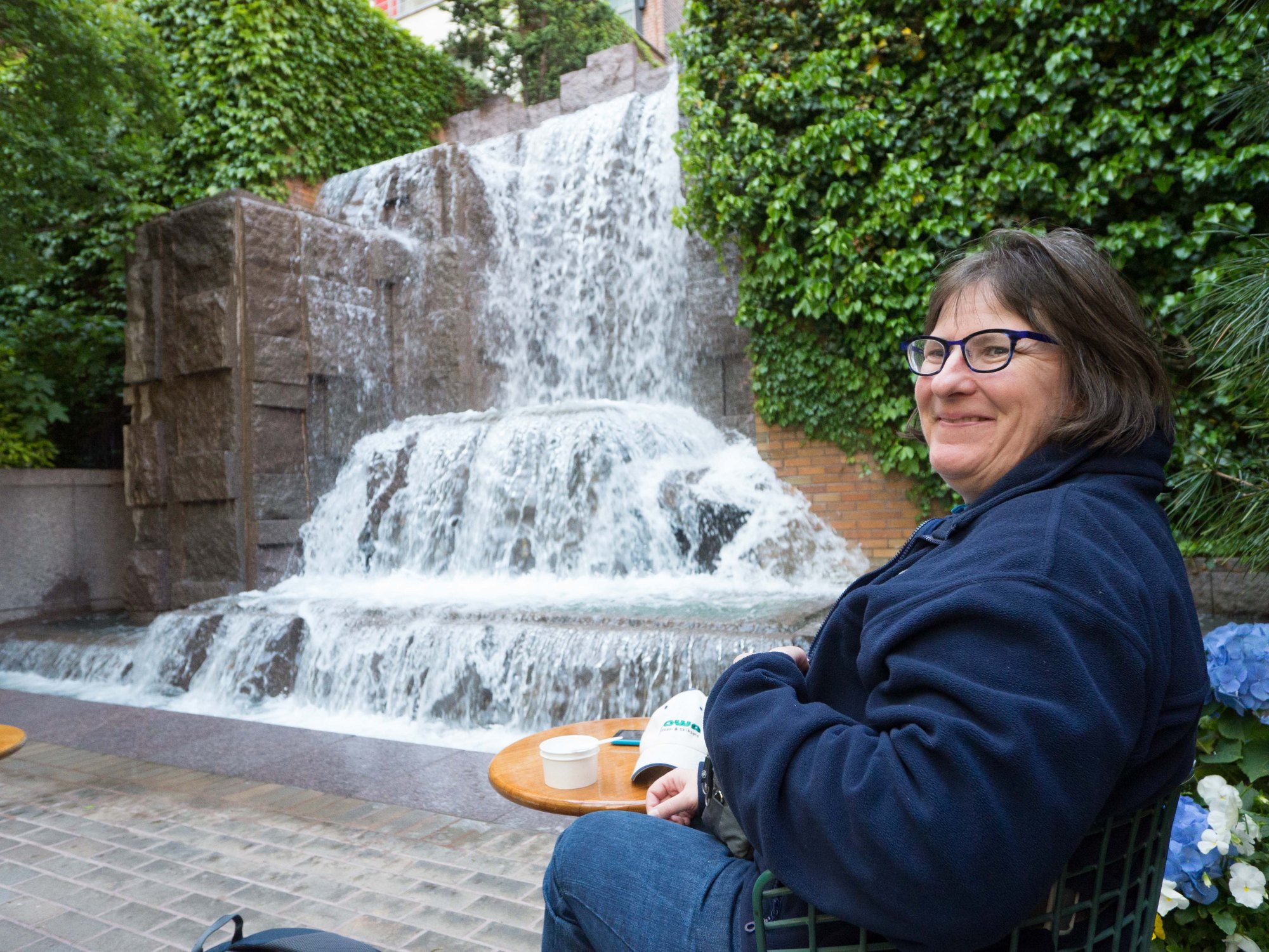 Da unser Hotel zwischen der 49th und der 50th Street liegt, ist es nicht weit dahin und es versteht sich von selbst, dass so ein Ort gesucht werden muss. Bei unserem ersten Versuch standen wir hier vor verschlossenem Gitter und irgendwo gab es den kleinen Hinweis, dass der „Park“ geschlossen wäre, wegen „treespraying“. Heute haben wir es noch einmal versucht und siehe da, das Wasser rauschte und die Oase der Ruhe war zugänglich. Gerade im Sommer, wenn es hier in der Stadt richtig heiss wird, wird das ein sehr gefragter Platz sein. Eigentlich ist es ein Brunnen, der einfach wie ein Wasserfall gestaltet ist. Dafür stehen Tischchen und Stühle, Bänke zum Ausruhen. Ein kleiner Imbiss ist da und wir konnten hier ein Eiscreme geniessen. Hier scheint die Zeit stehen zu bleiben in dieser hektischen Stadt.