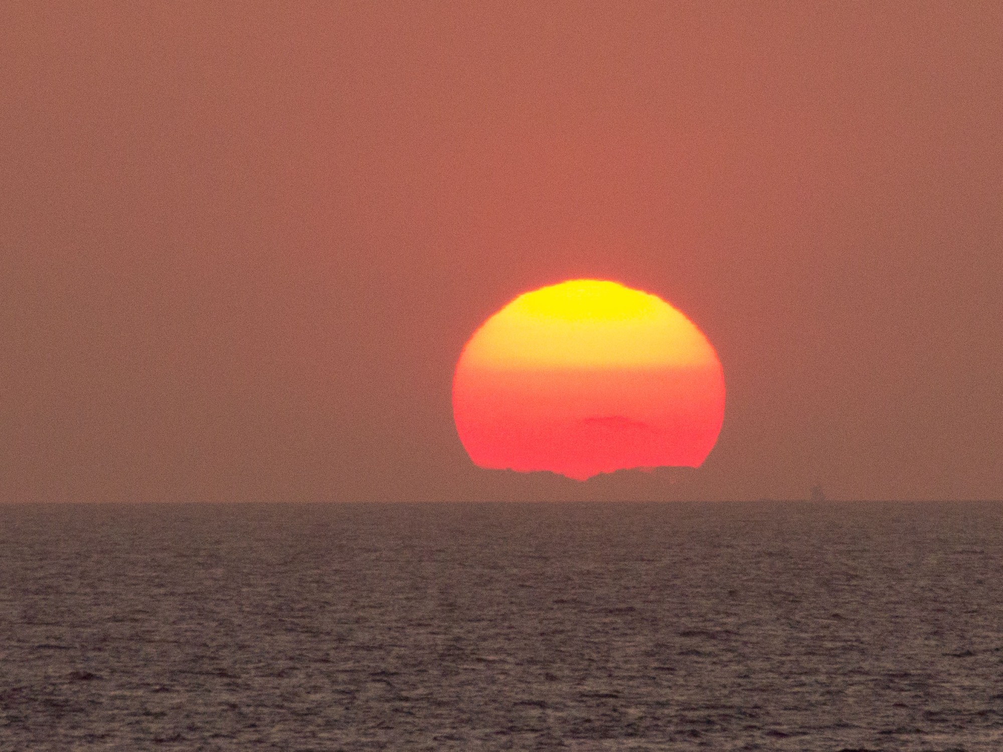 Seit dem Dienstag abend vor einer Woche haben wir keine Land mehr gesehen. Endlich ist es wieder soweit: im Laufe des Nachmittags fahren wir in den Aermelkanal ein. Erst sieht man auf Backbord in der Ferne Land auftauchen, eine der Scilly-Inseln. Nach einer ganzen Weile gibt es wieder Land zu sehen kurz vor Sonnenuntergang. Die See wird auch wesentlich ruhiger, das Wasser scheint abzulaufen (gegen Ebbe hin). Wunderschön versinkt der Sonnenball hier im Meer und wir können zusehen und die letzte Kappe auch versinken. Selten sieht man das so schön. Oft scheint es, als ob der Ball gar nie das Wasser berühren mag und er sich vorher auflöst wir ein Tropfen auf der heissen Herdplatte.