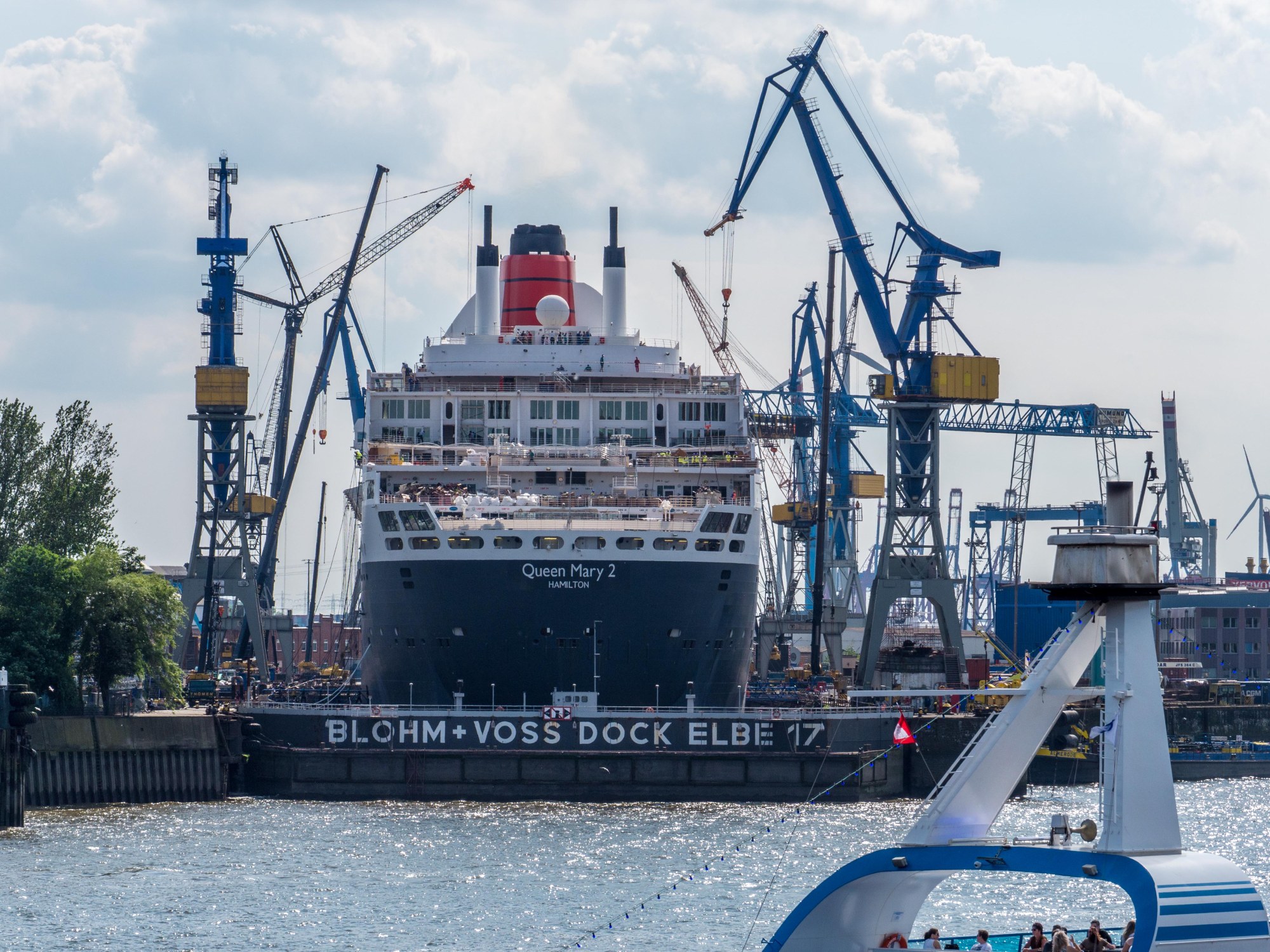 Hier im Dock Elbe 17 arbeiten tausende daran, dass die Königin der Meere, wie Mary 2 auch genannt wird, innerhalb 3 Wochen komplett umgebaut wird. Sie erhält ein zusätzliches Deck oben draufgesetzt, viele der Lokale im Innern werden vollständig umgestaltet und die Kabinen renoviert. Das sei nach 12 Jahren Betrieb notwendig. Man hörte während der Passage gelegentlich, dass sie danach nicht mehr wieder zu erkennen wäre.