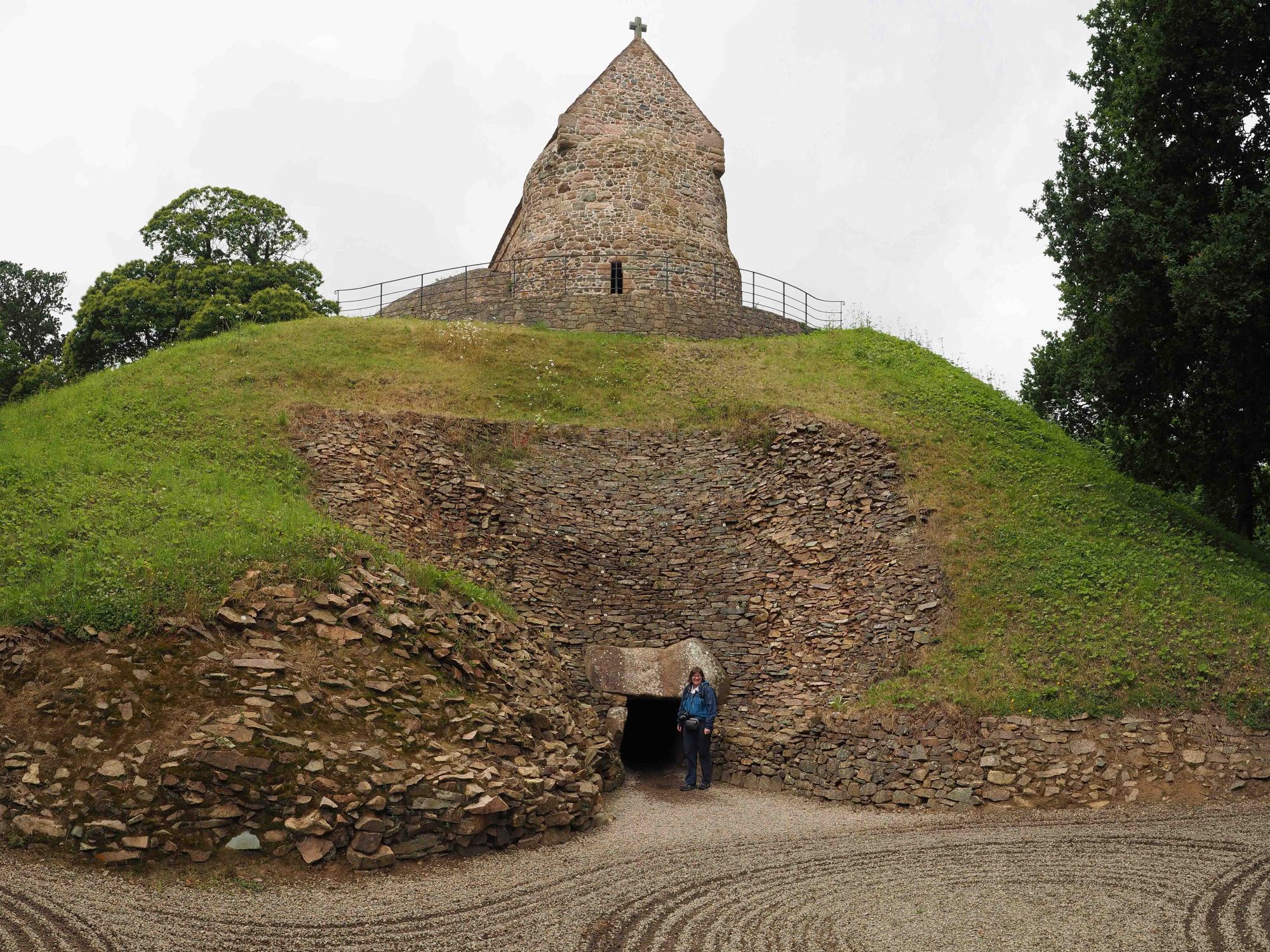 Hier ist es nicht so gross, der Gang, der zur Kammer führt ist so niedrig, dass man fast kriechen muss. Die Wände und die Decke werden von grossen Steinplatten gebildet. Die Hauptkammer hingegen ist so hoch, dass gut aufrecht stehen kann. Seitlich sind 2 kleine Kammern angeordnet, in denen man bei der Entdeckung menschliche Knochen von mindestens 8 Individuen und Grabbeigaben gefunden hat. Ganz hinten gibt es einen abgetrennten Raum, von dem vermutet wird, dass er der heiligste und bedeutendste war. Solche Anlagen werden als Gang-Gräber bezeichnet, auch wenn naheliegt, dass sie auch sonst in der Kultur der Menschen in der Zeit eine grössere Bedeutung gehabt haben mussten. Diese Anlage wurde sorgfältig nach Westen ausgerichtet, so dass die aufgehende Sonne zum Frühlings- und Herbstanfang bis in die Kammer scheinen konnte. Ausserdem wurde sie aufwändig zugedeckt; erst mit Gesteinsmaterial und danach mit Erdreich. Dieses wurde mit (Trocken-)Mauern gestützt, so dass es nicht abrutschen konnte. Der Hügel deckt die Anlage 14m hoch zu und ist einfach eine grasbewachsene Erhebung in der Landschaft. Als die Anlage verlassen wurde, wurde der Eingang zugeschüttet und die Kultstätte so wirkungsvoll versteckt.