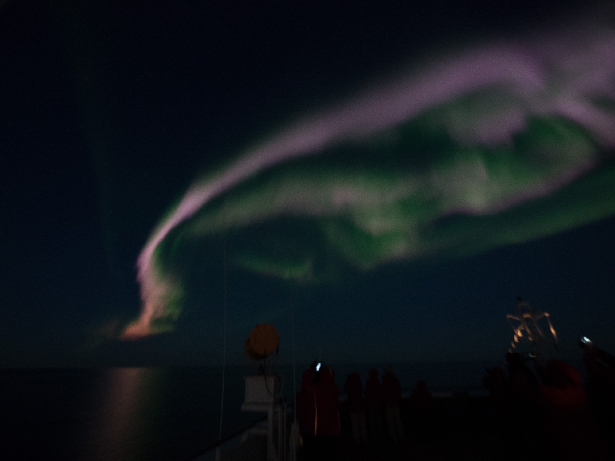 Wir hatten nicht gerechnet, auf dieser Reise in den Genuss von Polarlichtern zu kommen. Eher war die Mitternachtssonne in unseren Köpfen verankert, auch wenn wir eher spät im Sommer unterwegs sind. Wir sind jedoch so weit in den Norden gelangt, dass es ein paar Tage lang keinen Sonnenuntergang gegeben hat. In den letzten Tagen sind wir aber wieder bis unter den 70. Breitengrad gefahren und wir nähern uns dem Herbstpunkt im Jahr. Ausserdem sind wir schon wieder auf der westlichen Hemisphäre, unsere Uhren gehen aber nur 10 Stunden voraus. Das beschert uns relativ frühe Sonnenuntergänge. In den letzten klaren Nächten konnten wir darum wunderbare Polarlichter beobachten und fotografieren. In Wirklichkeit sind sie nicht so intensiv, wie sie auf den Bildern erscheinen. Das Spiel mit den Bewegungen und den Farben am Himmel ist jedoch ein äusserst faszinierendes Erlebnis.