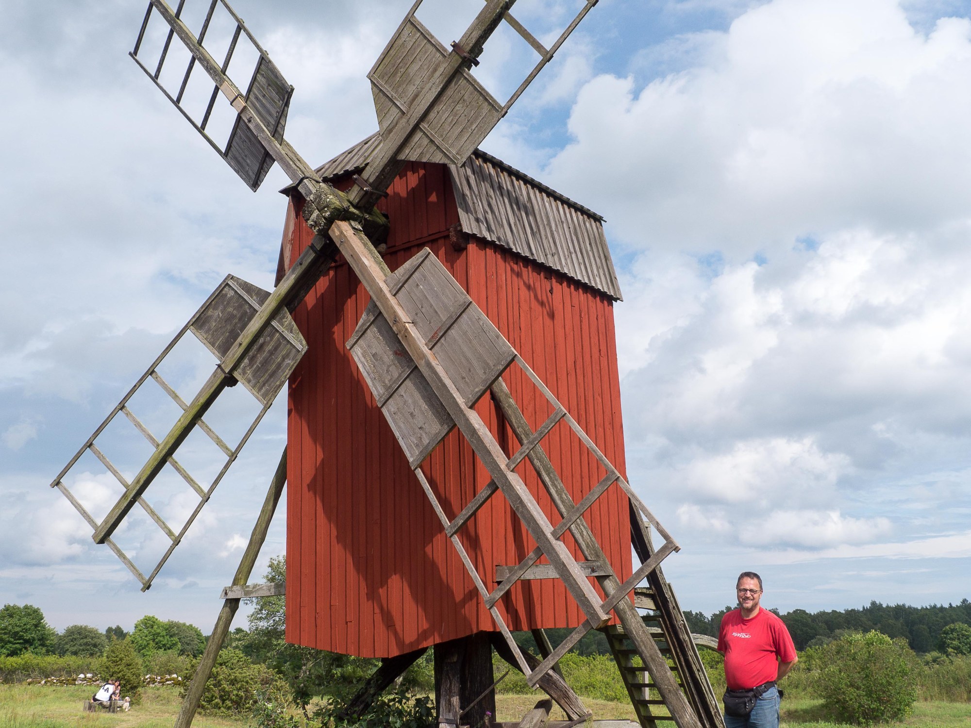 Ein weiteres Element, das die Landschaft auf Öland prägt, sind die Windmühlen. Sie sind meist kleiner als diejenigen, die man in Holland antrifft. Bei starkem Wind hätte ich wohl Angst, dass das Gebäude umkippen könnte, aber das wird wohl nicht oft passiert sein. Sonst gäbe es diesen Typ Mühle nicht so oft hier. Fast in jedem kleinen Dorf sieht man diese Mühlen und es gibt Orte, da stehen bis zu 7 in einer Reihe an der Strasse. Die einen sind einfach dunkel gefärbt oder von Wetter gegerbt, andere sind rot bemalt. Auf dem Sockel mit 4 Füssen (wie bei einem klassischen Bürostuhl) sitzt das Gebäude mit einer Seitenlänge von weniger als 3 Metern und einer Höhe von vielleicht 5 Metern. Dieses ist drehbar, dazu gibt es bei der Ausgangstür einen langen Stiel, an der der Müller vermutlich die Mühle in den Wind gedreht hat. Die Treppe ist auch gleich da und dreht sich mit der ganzen Mühle mit, schliesslich ist es nicht praktisch, wenn man das Haus hinter dem Windrad betreten müsste. Die WIndräder sind heute zu einem kleinen Teil mit Holz gefüllt, der Rest ist leer. Ich weiss nicht, ob diese immer ganz mit Holz gefüllt waren oder ob auch hier Textile Füllungen gebraucht wurden. Bei einigen schienen mir die Flügel auch im Anstellwinkel verstellbar, was ich aber nicht sicher feststellen konnte.