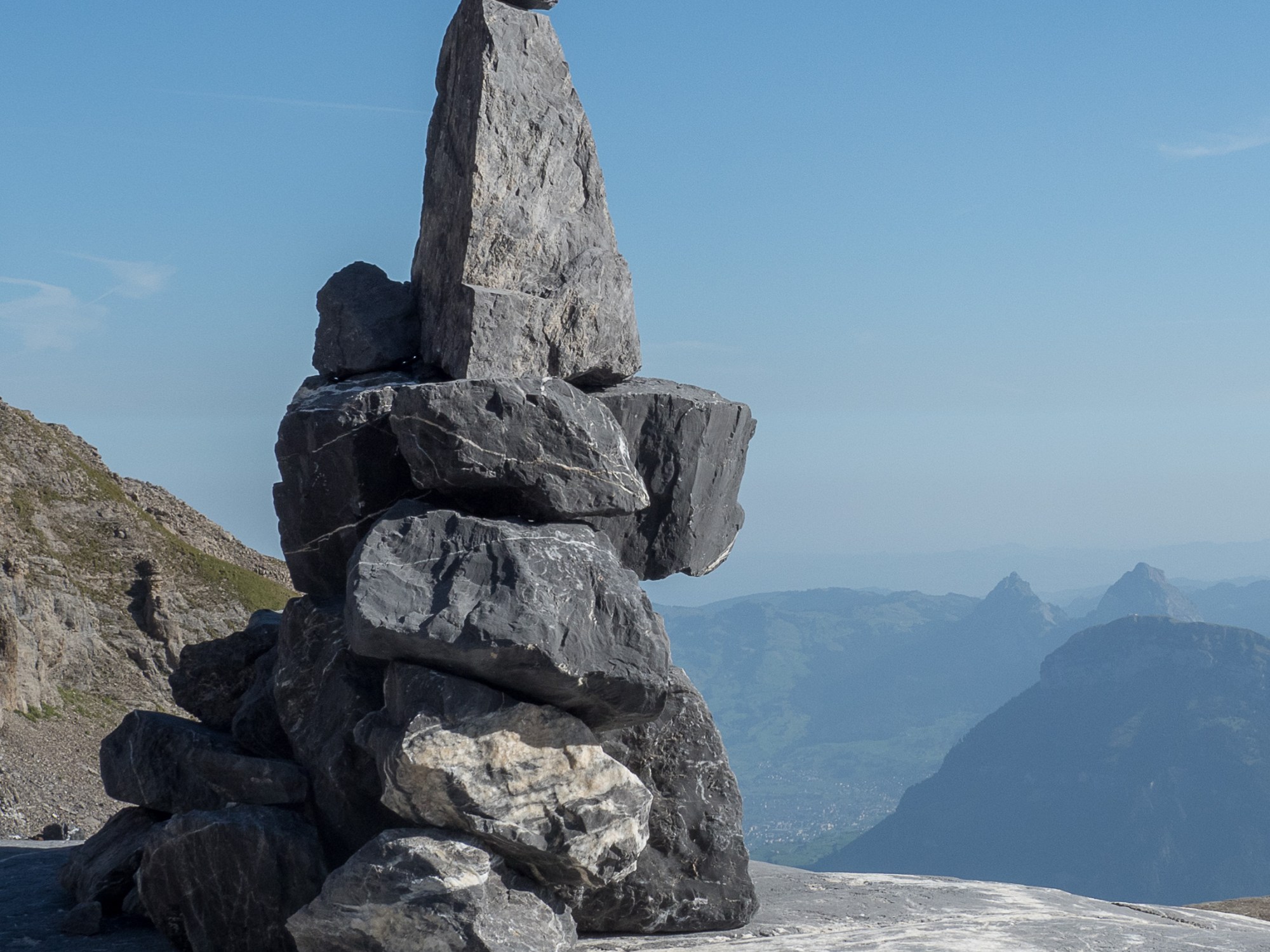 Auf der Karte ist hier noch ein Chlitaler Firn eingetragen, von dem ist heute aber kaum mehr etwas zu sehen. Auf den Resten davon liegt so viel Geröll und Schutt, dass das Eis nicht zu sehen ist. Der Firn hat wohl seit vielen Jahren keinen Zuwachs mehr erhalten. Auf 2800m Höhe erreichen wir den Grat des Gipfels, den wir nach knapp 4 Stunden erreichen. Herrschte beim ersten Mal hier ein scharfer Wind ist es heute windstill und angenehm von der Temperatur. Auch an dem Dienstag sind auf dem Gipfel ca. 20 Personen anwesend während der Stunde, die wir hier verbringen.