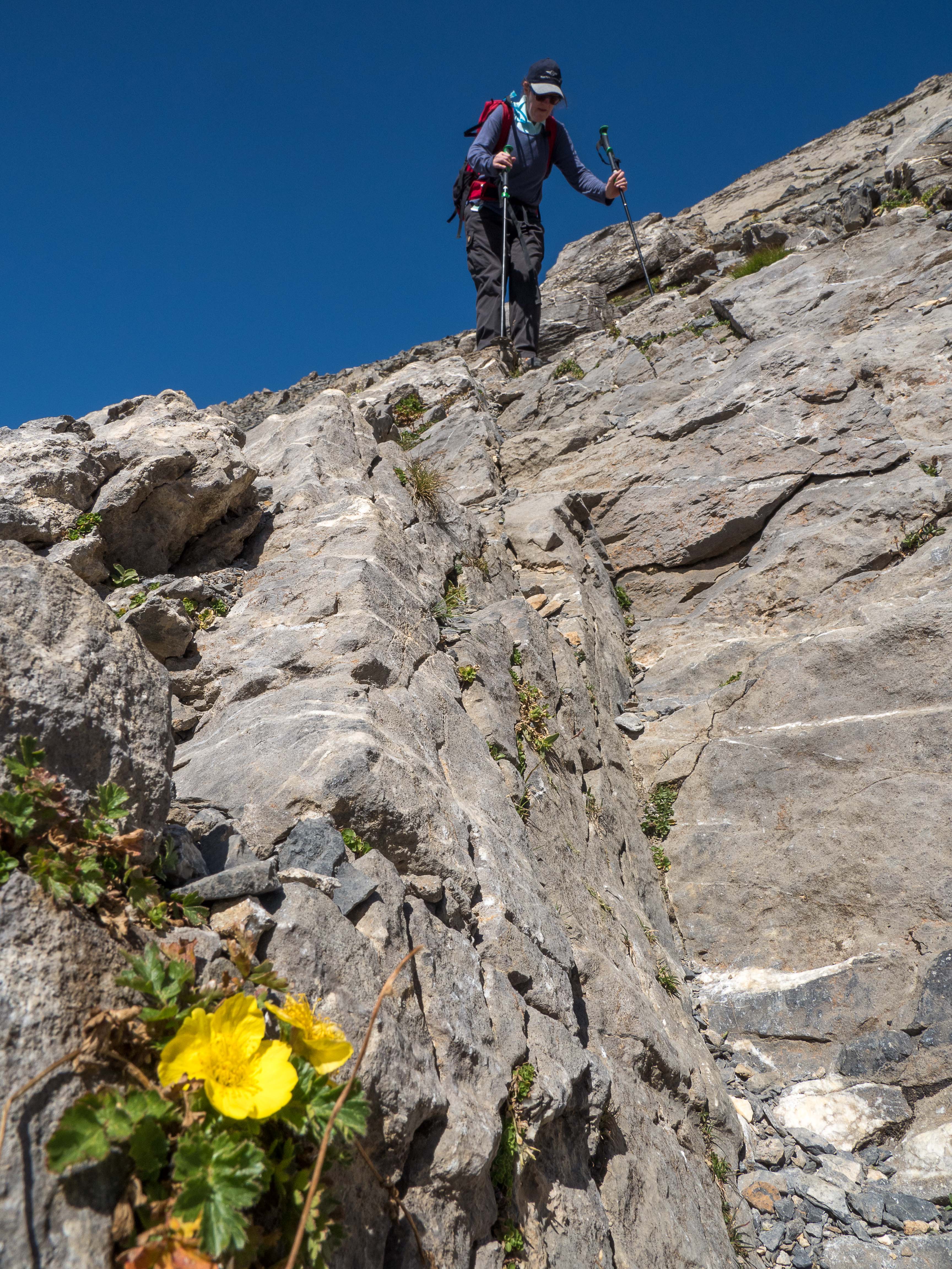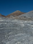 Wir übernachten hier und starten am frühen Morgen bei blauem Himmel zu unserer Tour. Der Aufstieg ist zu Beginn steil, wir sind froh, dass die Temperaturen im einstelligen Bereich liegen. Nach etwa 2 Stunden erreichen wir ein Plateau auf 2280m Höhe. Hier lag vor noch nicht allzu langer Zeit ein Gletscher, der über die Kante davor abgebrochen ist. Noch vor 30 Jahren war von der Alp ein mächtiger Eisabbruch zu sehen, wie die Wirtin uns erzählte. Jetzt ist hier kein Eis mehr zu sehen. In Geröll wandern wir über die Ebene bis wir hinter dem 2. Felsriegel recht abbiegen. Hier ist der Fels deutlich gestuft, wie eine Treppe für Giganten, immer wieder 10-20m leicht abfallend, dann eine Stufe von einigen Metern Höhe. Dazu gibt es immer wieder tiefe Karstlöcher und Spalten, es wirkt wie ein versteinerter Gletscher.