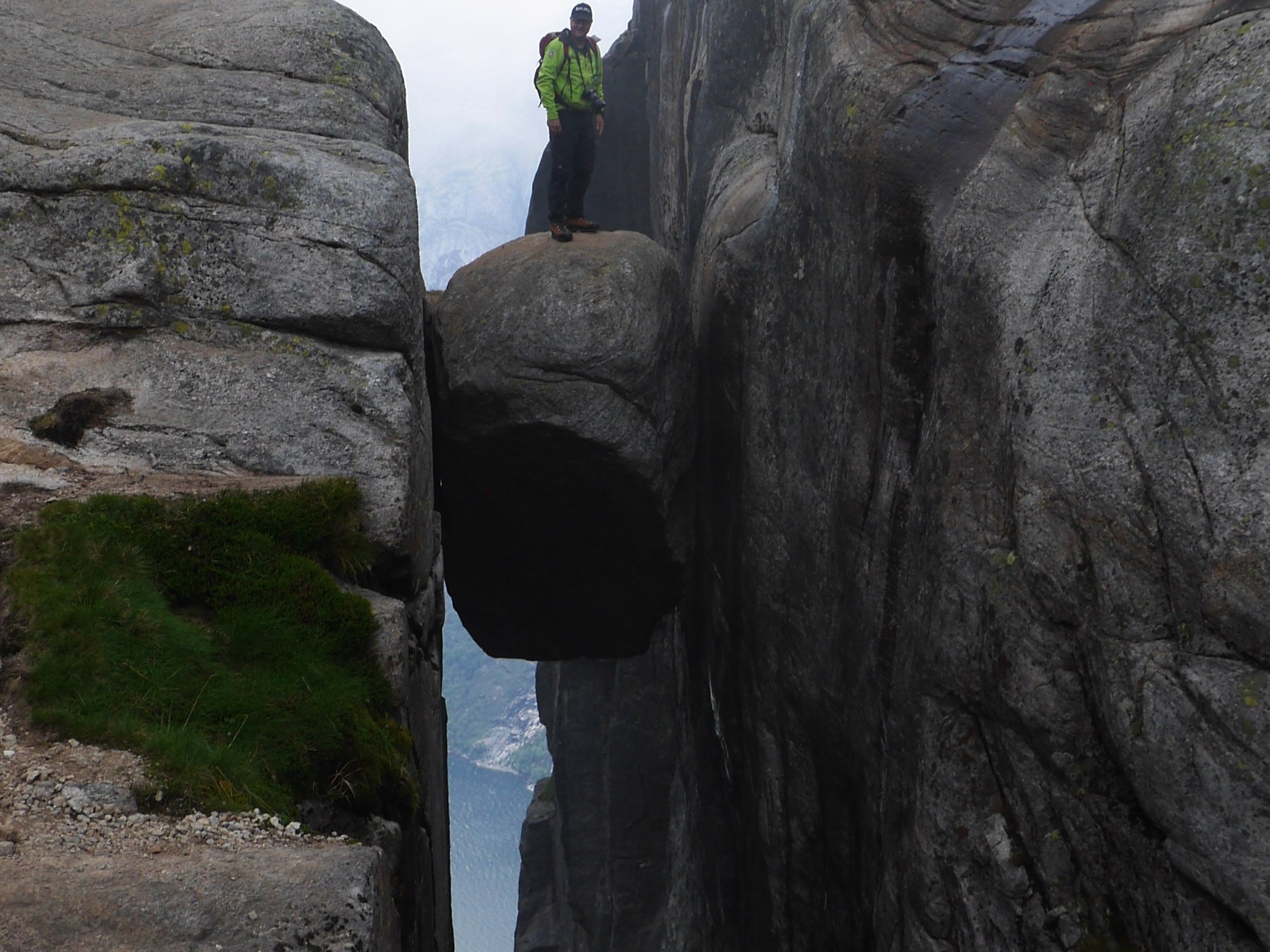 Sicher hat der eine oder die andere ein ähnliches Foto schon gesehen (aber nicht von uns). Der Kjeragbolten ist ein bekanntes Ziel am Lysefjord in Südnorwegen. Wir sind heute nach Lysebotn gekommen und wollten eigentlich erst morgen zum Bolten gehen. Allerdings sieht es so aus, als ob das Wetter da nicht mitmachen will, Regen und stürmische Winde sind angesagt. So haben wir unsere Pläne kurzerhand umgestellt. Die Tage hier sind ja im Sommer deutlich länger und so ist es durchaus auch vertretbar, noch um 16 Uhr zu starten. Die Tour zum Kjeragbolten ist bei gutem Wetter problemlos zu machen. Der Weg führt oft über nackten Fels, der aber meist rauh und griffig ist. An vielen Stellen sind auch Ketten angebracht, die aber nicht immer den besten Weg zeigen. Gut 5 km geht es bergauf und immer wieder etwas bergab bis man oben an der Kante 1000m über dem Fjord steht und in dieser Felsspalte klemmt ein mächtiger Stein. Wir gehen zügig und kommen nach gut 2 Stunden hier an. Unter diesem Stein sieht man direkt in das Wasser des Fjord. Nach einer kurzen (Foto)-Rast machen wir uns auf den Weg zurück. Auch hier benötigen wir fast gleich lang und kommen kurz vor halb 9 beim Auto an. Die Sonne scheint wieder, sie steht immer noch recht hoch am Himmel.