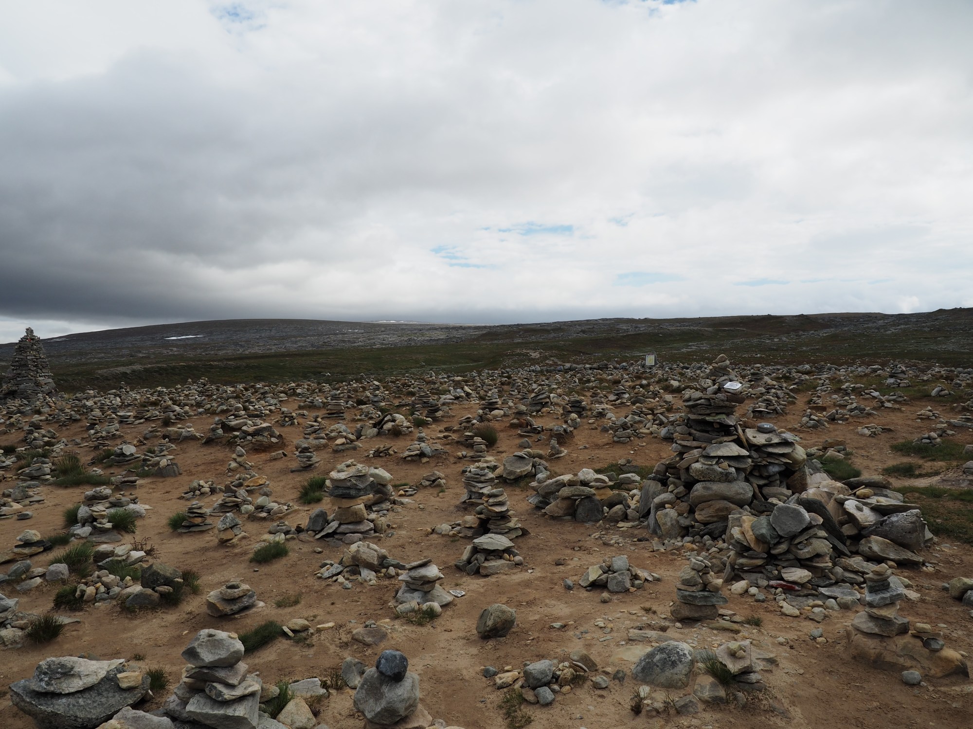 Auf dem Weg in den Norden von Norwegen muss man entweder die Küstenstrasse benützen (Kystiksveien FV17), wo eine ganze Anzahl von Fähren zu benützen sind, oder man fährt auf der E6, der Hauptverkehrsader für den Fernverkehr, auch Strassen-Güterverkehr. Dabei muss zwischen Mo i Rana und Bodø der Saltfjellet überwunden werden. Der Übergang ist zwar „nur“ gut 700m hoch, doch die Hochebene hier am Polarkreis ist ein hartes Pflaster für Pflanzen. Die Sträucher halten sich flach am Boden und einzig in Senken sieht man etwas höheren Bewuchs.