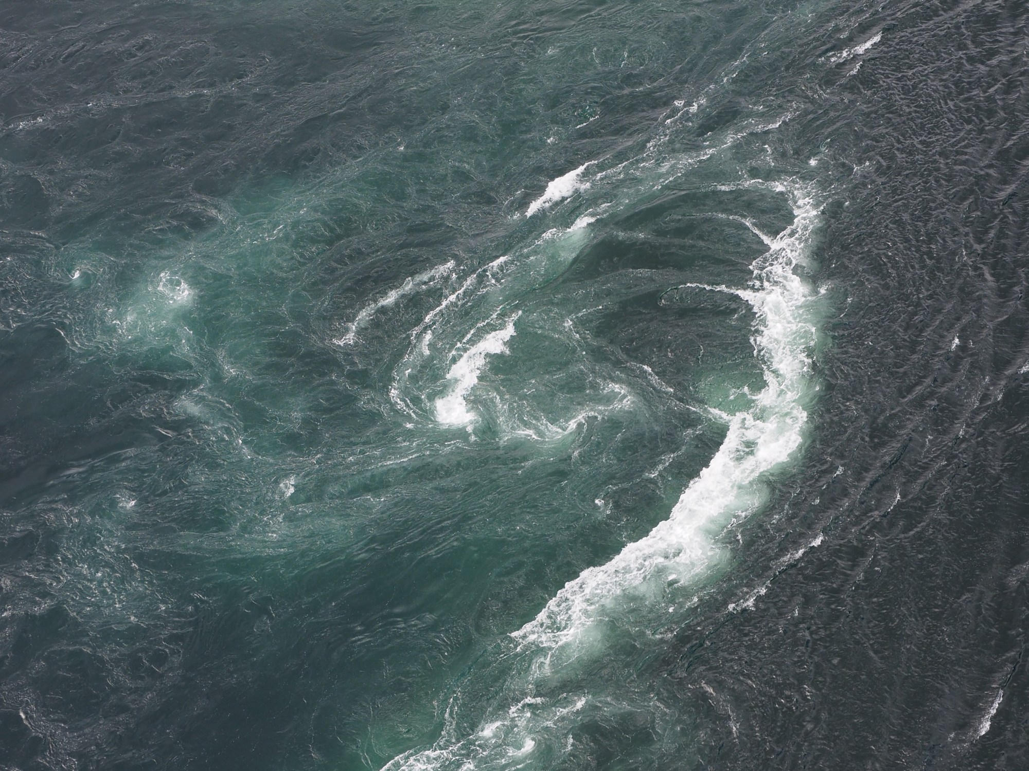 Mit den Gezeiten, die hier eine Veränderung des Wasserstands im Saltfjord von etwa 1.5 bis 2 Metern bewirkt, wird hier eine Strömung erzeugt, bei Ebbe in den Saltstraumen und bei Flut in den Skierstadfjord hinein. Währen der 6 Stunden werden 400Mio Kubikmeter Wasser bewegt und der Strom erreicht eine Geschwindigkeit von 20 Knoten, das sind fast 40 km/h. Dabei enstehen gewaltige Wirbel an den Rändern oder an Mini-Inseln, die sich in dem Strom noch befinden.