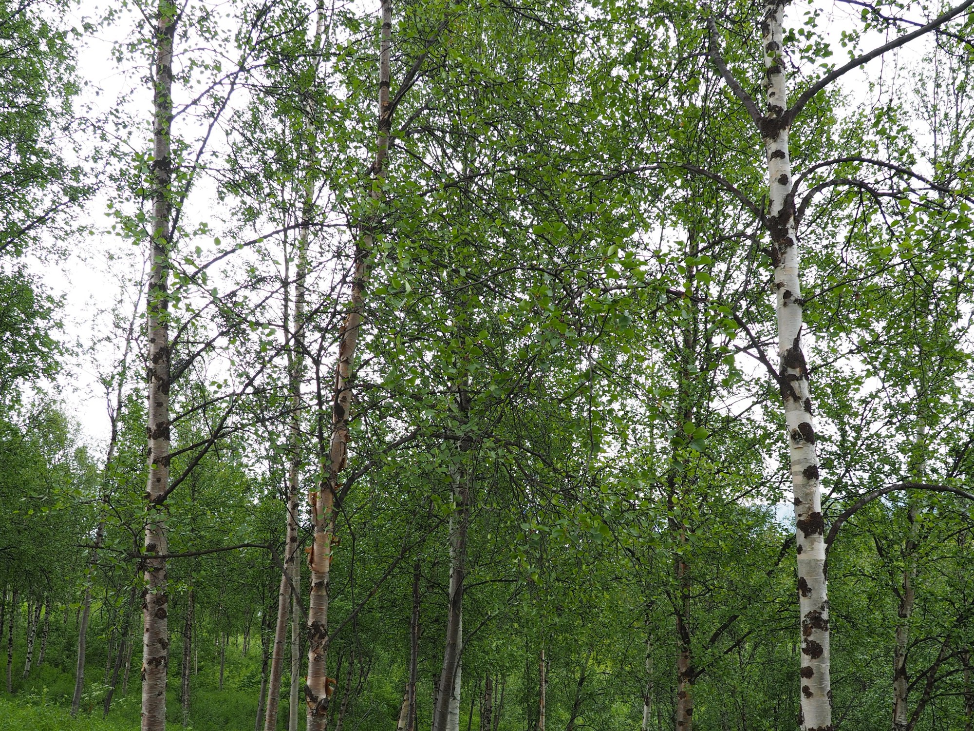 Es erstaunt zu sehen, dass hier in diesen hohen Breiten noch saftig grüne Wiesen zu finden sind, Wälder bis in mehrere Hundert meter über Meereshöhe wachsen, und nicht nur Pionierbäume wie die Birke, wenngleich diese hier am häufigsten ist. Die Bäume wachsen nicht so hoch wie bei uns, das ist wahr, aber sie sind mehrere Meter hoch und stehen oft dicht beieinander. Darunter wachsen Beerensträucher (Blaubeere), Farne oder Schachtelhalm in grossen Mengen. Föhren halten sich in dem wenigen Boden auf den Felsen fest.