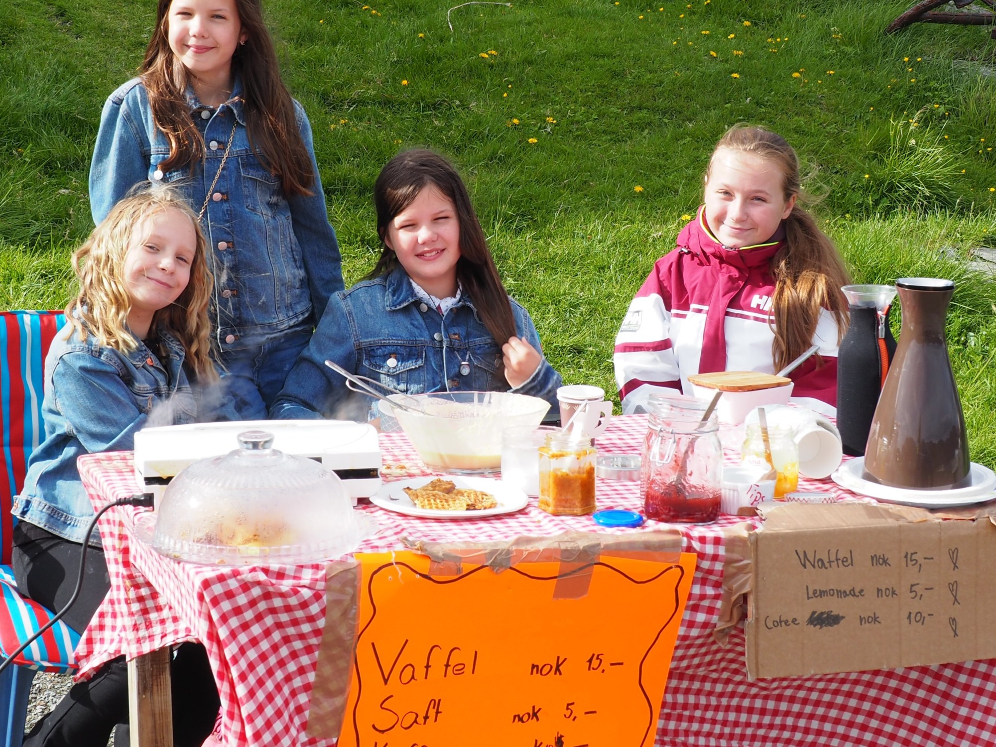 Zum Glück haben wir den Weg nicht gleich gefunden, so sind wir in Richtung Hafen gegangen und haben die Mädchen angetroffen, die hier an einem kleinen Tisch einen Waffelstand aufgebaut haben. Für 15NOK bieten sie leckere Waffeln zum Verkauf, wir haben uns leicht überreden lassen, eine zu essen. Ich hoffte, dass sie mir sagen könnten, wo der Weg wäre, aber leider sind sie nicht hier zuhause, vermutlich einfach in den Ferien. Der Umsatz heute wird nicht sehr gross gewesen sein, es bewegen sich nicht viele Leute in dem Dorf. Die Idee, sich ein Ferientaschengeld so zu verdienen finden wir jedoch wirklich niedlich.