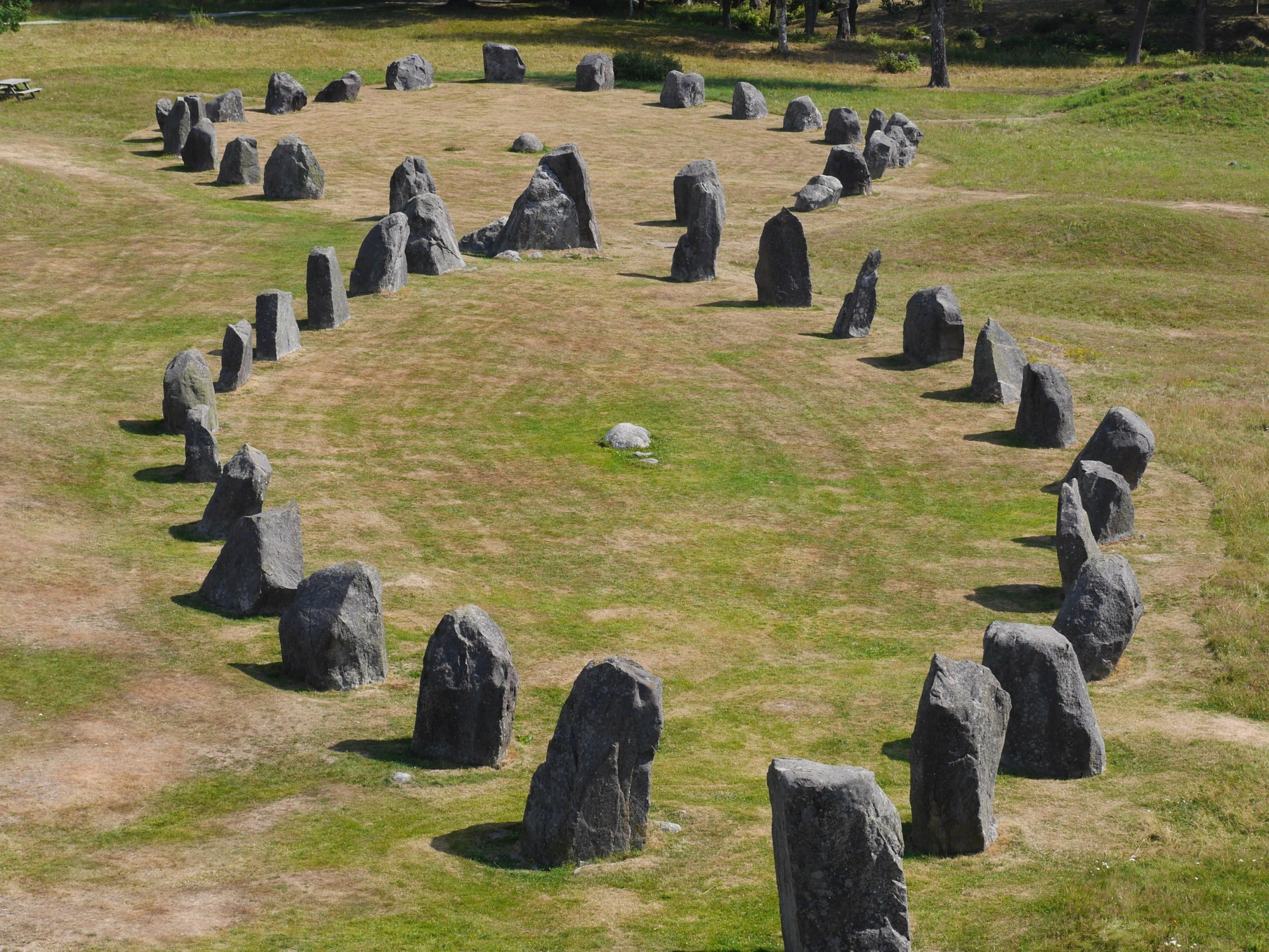 Anundshög wird mit dem legendären König Bröt-Anund in Verbindung gebracht, obschon auch andere Plätze als dessen Ruhestätte vermutet werden. Hier steht aber ein Runenstein, in dem der Name Anund erwähnt wird. Wer immer es war, das Reich und der Hof dieses Herrschers wurde später gründlich zerstört, so dass es keine gesicherten Informationen dazu gibt. Bei den Schiffslegen wurden, wohl in der Zeit der Christianisierung, die Steine umgeworfen, wohl um die heidnischen Bräuche sichtbar von sich zu weisen. 4 der 5 vor Ort wurden in den letzten Jahren wiederhergestellt, die 5. wartet darauf. Ein grosser Platz oder Strasse ist mit Menhiren (und eben jenem Rundenstein) gesäumt, er wurde wohl auch als Thingplatz genutzt, Rats- und Richtplatz. Dieser wurde bis ins 13.Jh weiterhin genutzt und danach vor die damals neu errichtete Kirche in Badelunda verlegt.
