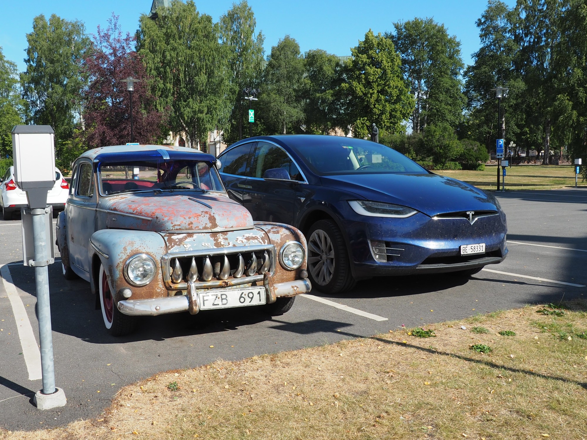 Anders sieht es beim 2. Beispiel aus. Auf dem Parkplatz bei der Kirche von Badelunda steht da dieser niedliche Morris Minor 1000. Gepflegt, die Sitze etwas rissig aber der Lack ist gut im Schuss. Der Fahrer, der bald dazukommt berichtet, dass dieses Auto aus dem Jahr 1959 stammt und seinem Grossvater seit 1960 gehört habe. Seit da sei es in Familienbesitz. Er steigt ein, interessanterweise bei der rechten Tür und rutscht durch zum Lenkrad auf der linken Seite, offensichtlich wurde es bereits für Rechtsverkehr hergestellt und angeschafft.