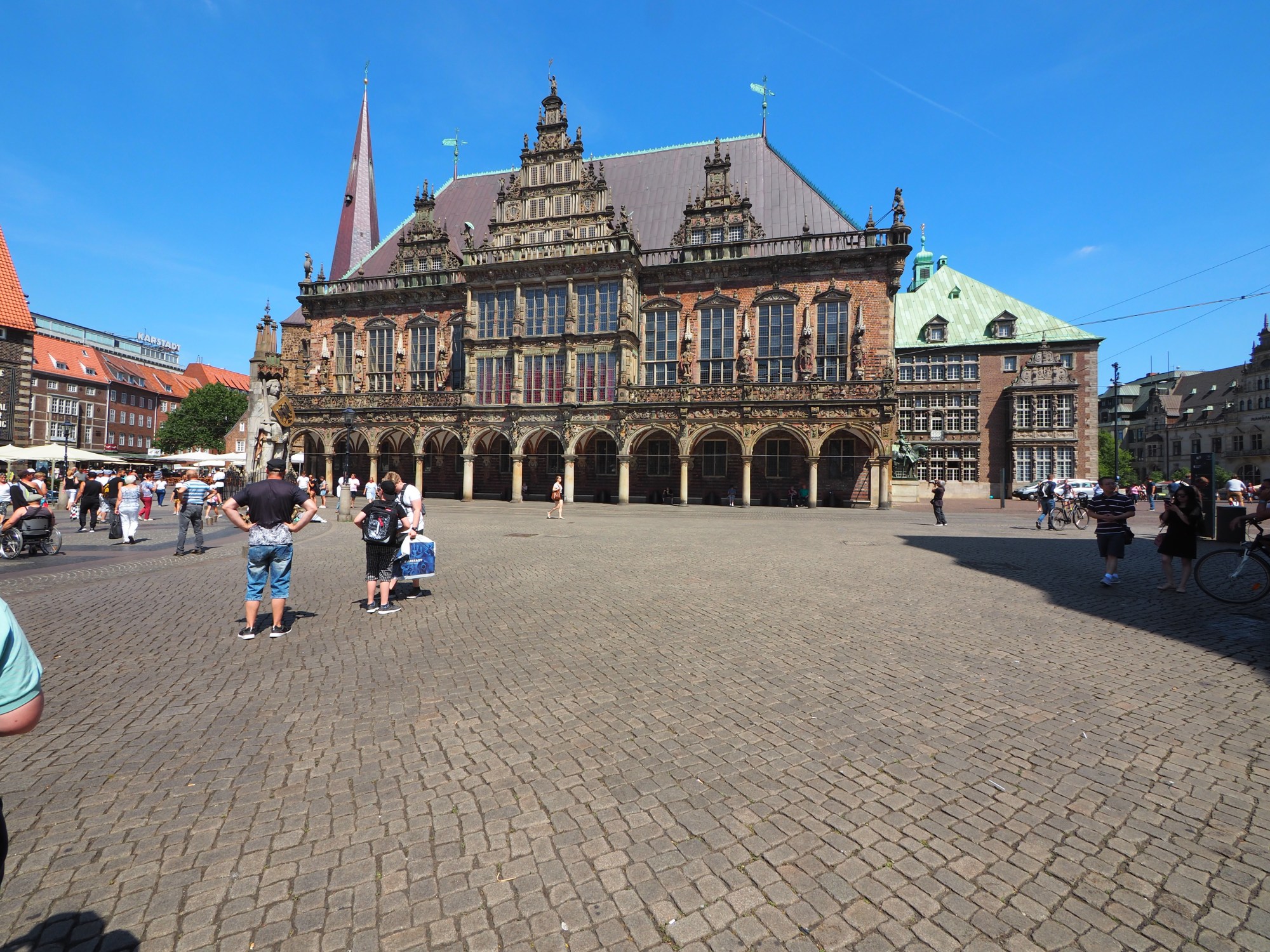 Die bronzene Plastik mit den Bremer Stadtmusikanten ist dagegen etwas unscheinbar neben dem Rathaus aufgestellt.