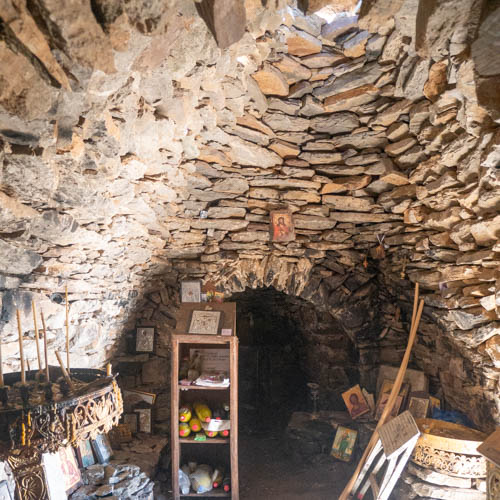 Durch eine schmale Öffnung kommt man in die Kapelle, Türe gibt es keine. Du musst dich klein machen und darfst auch nicht zu breit sein. Drinnen findet sich eine Schale für die Kerzen, die Gläubige hier entzünden wollen. Einige schmale, lange (Bienenwachs-)Kerzen liegen bereit und auch eine Schale für die Opfergaben steht dabei. in dieser finden sich viele Euromünzen, aber auch eine 2-Franken Münze habe ich da gefunden. Einige Ikonenbilder sind hier hingestellt worden, ich gehe davon aus, dass Besucher diese hier gelassen haben, weil sie sich vom Heiligen Hilfe erbeten haben. In einem Regal liegen Flaschen mit Bienenwachs um Kerzen zu giessen. Ein zweiter Raum ist weitgehend leer und nur von innen mit diesem verbunden. Es gibt noch einen dritten Stein-Iglu der einen separaten Eingang hat. In diesem sind auch einige Reste von Übernachtern zu finden, einfache Isomatten, die hier zurückgelassen wurden. Alle drei Räume sind von einer ovalen Mauer umfasst als ein Gebäude. Die Kuppeln sind zusätzlich mit Steinen überdeckt, vielleicht um den Wind daran zu hindern, die Kuppelbauten abzudecken.