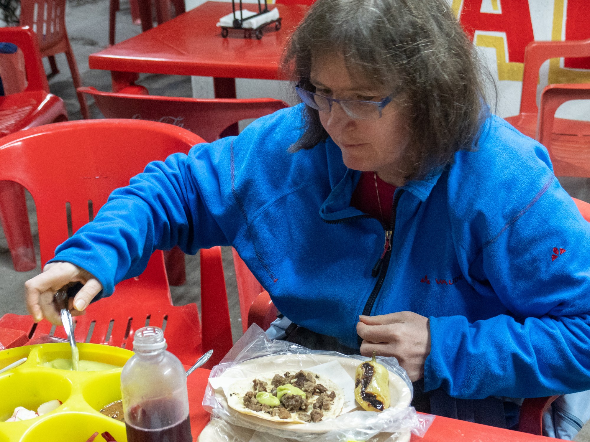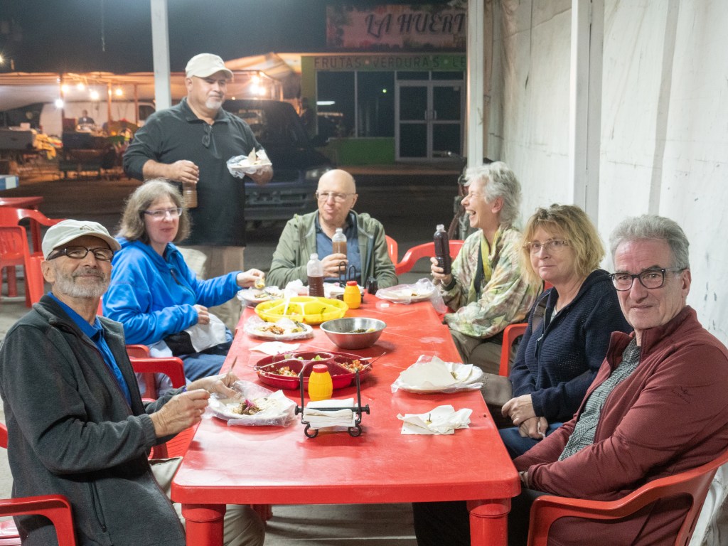 Auf dieser Reise sind wir in einer kleinen geführten Gruppe unterwegs. Unser Reiseleiter el Lobo (der Wolf) und der Chauffeur Martin bringen uns an die Orte, wo es etwas von der Natur zu sehen gibt. Zum Essen zeigen sie uns jeweils Lokale, in denen auch die einheimische Bevölkerung zum Essen hingeht. Allerdings war das letzte Restaurant wohl nicht mehr so gut wie die Jahre zuvor, so dass wir heute eine Alternative gesucht haben. Dabei haben wir uns geeinigt, auch mal ein einfaches Taco-Büdchen aufzusuchen und so ein leichteres Abendbrot zu essen. In Ciudad Constitution, wo wir jetzt die zweite Nacht verbringen, finden wir ein solches und essen was das Angebot hergibt. Tacos oder die grösseren Burros, wahlweise aus Mais- oder Weizenmehl hergestellt, gefüllt mit unterschiedlichem Fleisch mit oder ohne Käse (oder auch ohne Fleisch mit Käse. Beim Fleisch gibt es eine hiesige Art der Kutteln, Wurstfüllung oder gekochte Rindfleischwürfel, die noch etwas gebraten auf diese Tacos gelegt werden. Danach kann man diese selber mit den Tonatenwürfel-Salat, Guacamole oder unterschied-lichen Salsa ergänzen, einrollen und so geniessen. Dazu gibt es gegrillte Chili-Schoden, mehr oder weniger schaft, wobei nicht immer gleich erkennbar ist, welche jetzt mehr und welche weniger scharf sind. Essen in fernen Ländern kann manchmal auch ein bisschen ein Abenteuer sein…