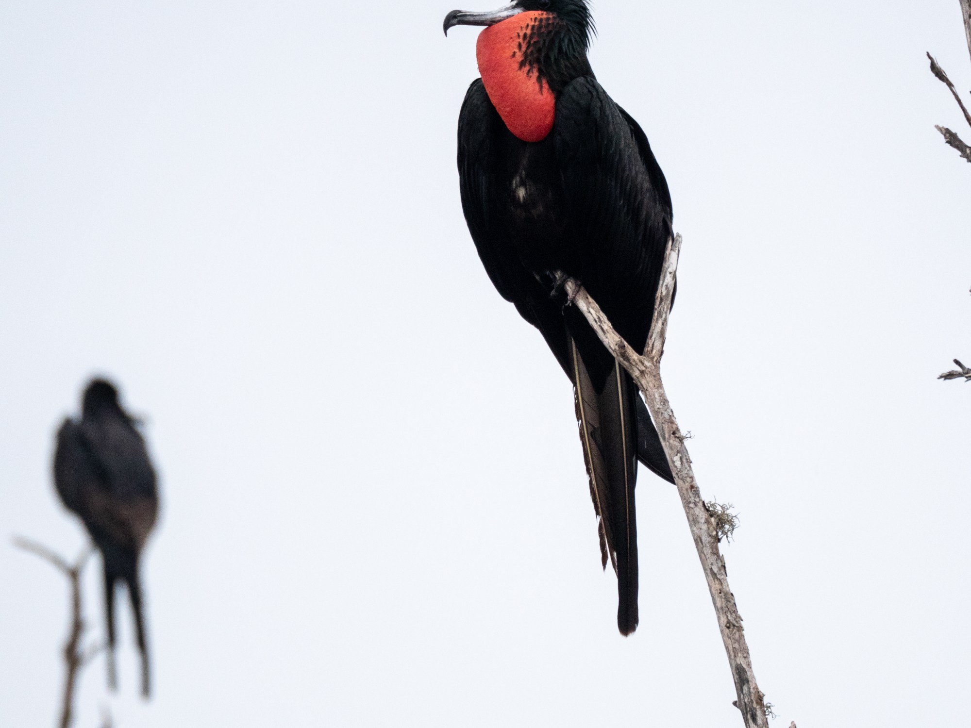 EIner der eindrücklicheren Vögel weltweit ist der (Pracht-)Fregattvogel. Einerseits ist er auffällig in der Brutzeit, wenn die Hähne ihren riesigen karminroten Kehrlsack aufblasen, um den Hennen zu imponieren. Dabei machen sie auch ordentlich Krach und streiten sichum die Nistplätze. Andererseits sind sie auch am Himmel im Flugbild sehr grazil und elegant, mit den schmalen Flügeln und dem langen gegabelten Schwanz. Sie sind grosse Künstler in der Luft und nutzen ihre Wendigkeit auch um anderen Seevögeln (Möven und ähnlichen) ihre Beute auf dem Weg zum Nest abzujagen. Wir sind in der Bahia Margerita an einer recht grossen Kolonie vorbei gefahren und konnten die Vögel fast in Greifdistanz beobachten. Noch ist keine Balz- oder Brutzeit, trotzdem zeigen die einen oder andern Männnchen bereits, worauf es ankommt, will man seine Gene weitergeben.