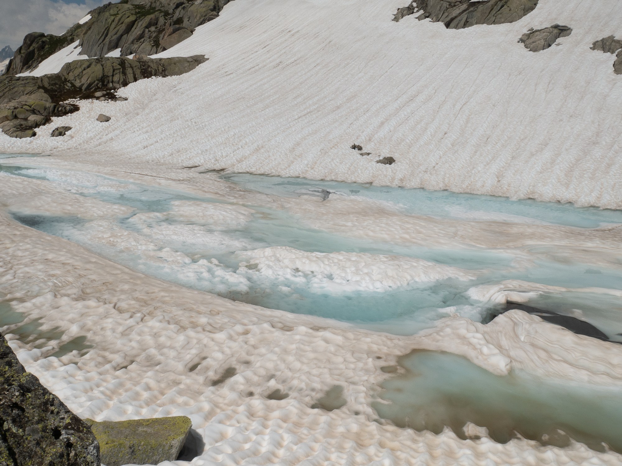 An diesem Tag soll es noch heisser werden, also versuchen wir es mit Höhe. Unsere Tour startet auf dem Grimselpass auf 2164m Höhe über NN. Hier ist es morgens noch ziemlich frisch, wenig über 10°C. Wir wollen heute nach Osten gehen über das Nägelisgrätli. Die Bergwanderung über diesen Rücken an der Grenze zwischen den Kantonen Bern und Wallis führt uns schon bald auf Schneefelder. In den Mulden und Rinnen liegt noch ordentlich vom gefrorenen Wasser und deckt den Weg zu. Dank der Karte und des GPS-Gerätes ist der Weg doch zu finden, auch wenn die beste Route im Schnee oft davon abweicht. In einigen Mulden haben sich im Schnee vom Schmelzwasser kleine Krater gebildet, in denen man etwas tiefer einsinkt.