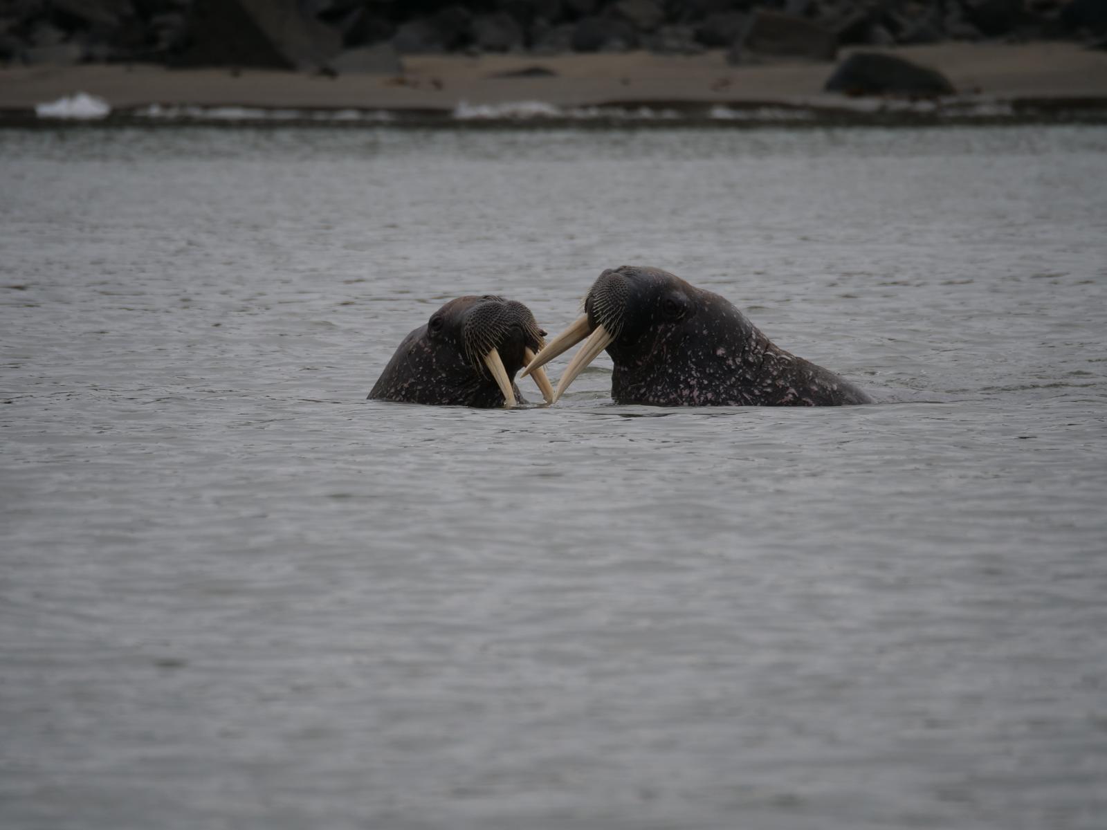 Diese geht in Gruppen, heute sind wir in der zweiten von vier Gruppen eingeteilt. Mit den Zodiacs fahren wir zum Strand mit den Walrossen. Einzelne sind auch im Wasser und kommen teilweise recht nah an die Boote heran. Dann ist es etwas Glücksache, in welchem Boot und in welcher Gruppe man dabei ist. Am Ufer um die alten Trapper-Hütten weiden 2 Rentiere. Wir treiben in den Zodiacs eine Weile am Strand herum, mal ist dieses Boot näher am Strand, dann sind andere in der ersten Reihe.