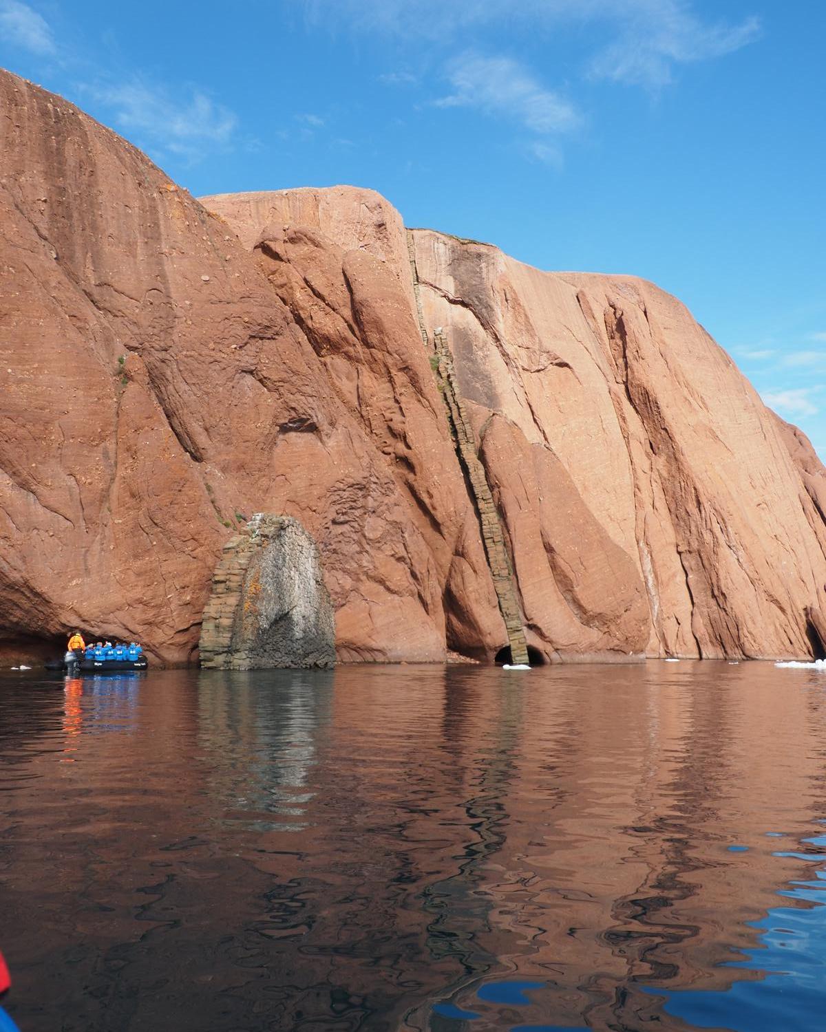 Die Rote Insel (dänisch Røde Ø) ist eine auffallende Felsinsel hier tief im Fjordsystem des Scorsby Fjord. Wir sind mittlerweile bei wenig mehr als 70° Nord. Über die Berge sieht man aber bereits den riesigen Eispanzer des Inlandeisschildes und die Gletscher, die hier kalben, sind alles Abflüsse dieses Inlandeises. Bei der Insel sind einige dieser weissen Riesen festgefahren uns schmelzen vor sich hin. Die Insel sieht auf den ersten Blick aus, als hätte man den Uluru hierher versetzt. Auch hier ist es ein roter, eisenhaltiger Sandstein, der unter den vielen hellen Granit- und Gneisbergen auffällt.