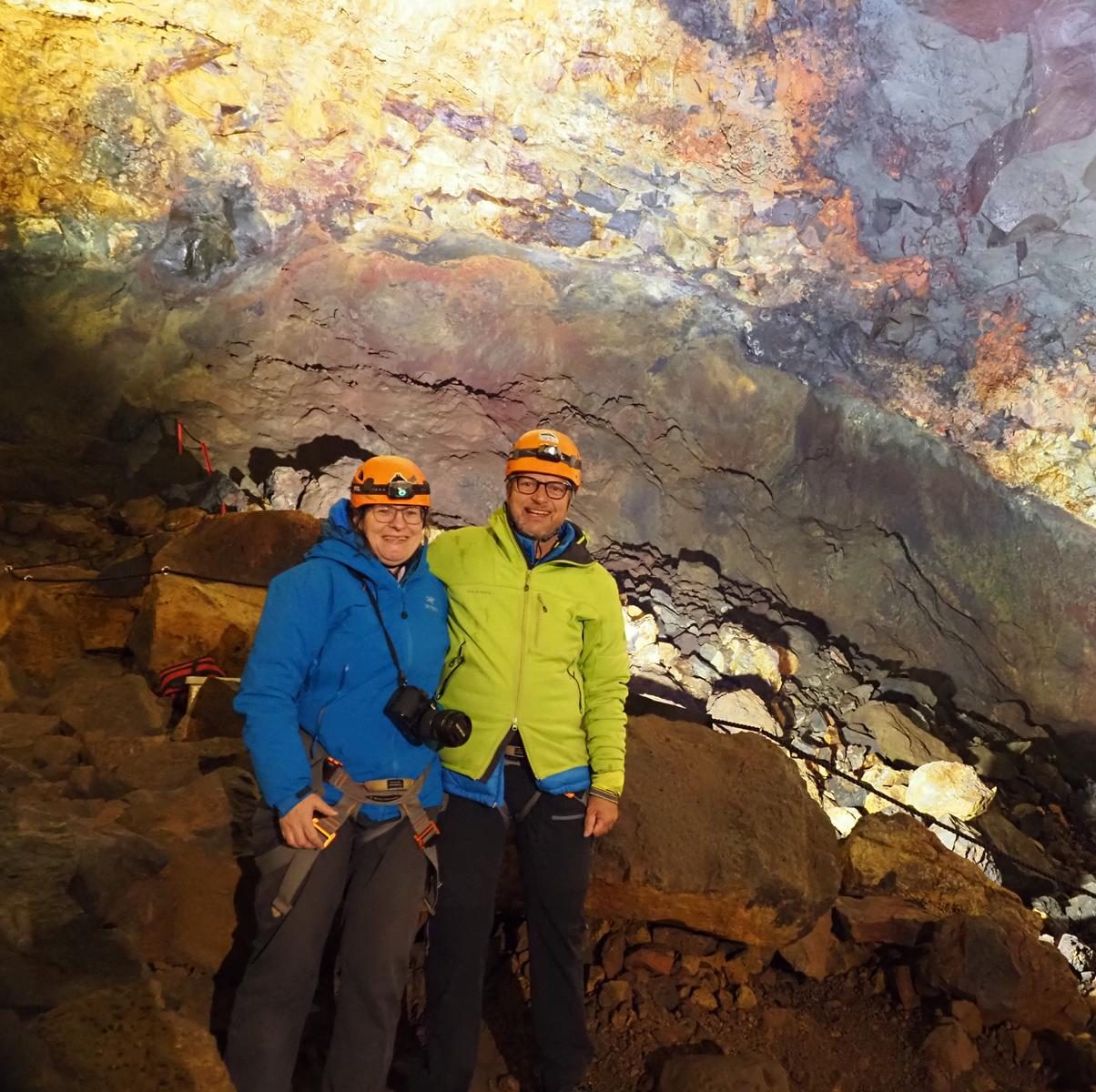 So stand es denn fast ganz oben auf unserer Bucket-List dieser Reise. Diese Tour kann von Reykjavik aus unternommen werden, an festgelegten Punkten werden die Teilnehmer eingesammelt zur Busfahrt auf die Lavaebenen über der Hauptstadt. Hier ist auch das zweitgrösste Skigebiet des Landes, Weltcuprennen werden allerdings keine abgehalten hier und es gibt auch Gründe, dass Isländer zum Skifahren auch in die Alpen fahren. Da wo wir das Schild vor 8 Jahren gesehen hatten, startet dann der Fussmarsch durch die moosbewachsenen Lavafelder. Stellenweise kann man in eingestürzte Lavatubes (siehe Undara) sehen. Der Guide erzählt, dass solche zu der Zeit, als Missetäter mit Bann belegt waren und sich im unbesiedelten Hochland durchschlagen mussten, solche Höhlen als Unterschlupf durchaus gesucht waren.