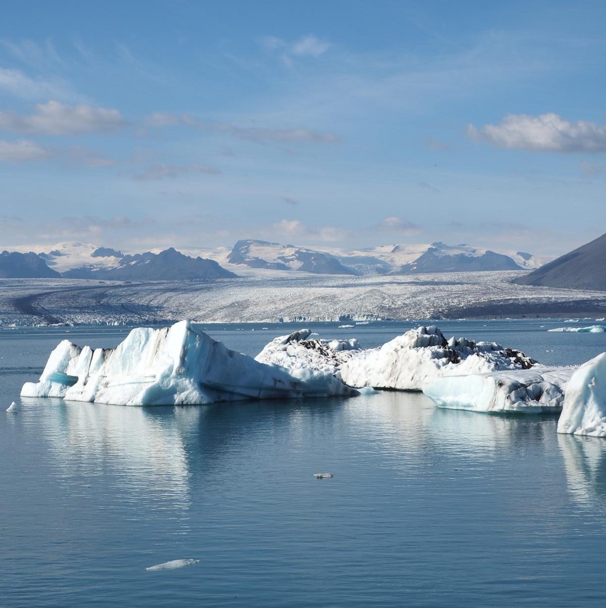 Der Breiðamerkurjökull ist einer der vielen Auslassgletscher des Vatnajokull, dieses riesigen Eisschildes, das einen grossen Teil des südlichen Island bedeckt. Dieser Breiðamerkurjökull ist selber ein mächtiger Eisstrom, wie wir in den Alpen keinen haben. Die Zunge reicht bis fast auf Meereshöhe hinab. Hinter einer Endmoräne hat sich ein grosser Gletscherrandsee gebildet. Der ist vom Meer nur durch einen kurzen Ausfluss getrennt, über den die Brücke der Ringstrasse führt.