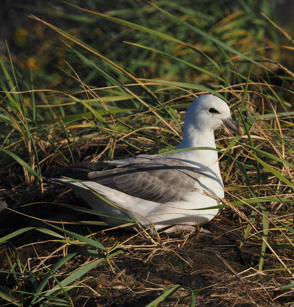 An dieser eher von Schwemmebenen geprägten Küste (meist flache Küste mit Sandstränden) gibt es hier Steilklippen, die von den Seevögeln gerne als Brutplätze genutzt werden. Einer ist der Eis-Sturmvogel. Er gehört zu den Röhrennasen (wie die Albatrosse) und ist ein eleganter Segler über dem Wasser. Hier findet er auch seine Nahrung und auch er kommt vorwiegend für das Brutgeschäft an Land. Die kleinen Eissturmvögel (englisch Fulmar) verlassen das Nest auf den Klippen normalerweise im August. Sie können noch nicht so gut fliegen und landen, wenn sie Glück haben, auf dem Meer. Hier werden sie von den Eltern weiter gefüttert, sie sind also so etwas wie Ästlinge, ein Jungvogel der das Nest verlassen hat, aber immer noch auf die Fütterung durch die Eltern angewiesen ist.