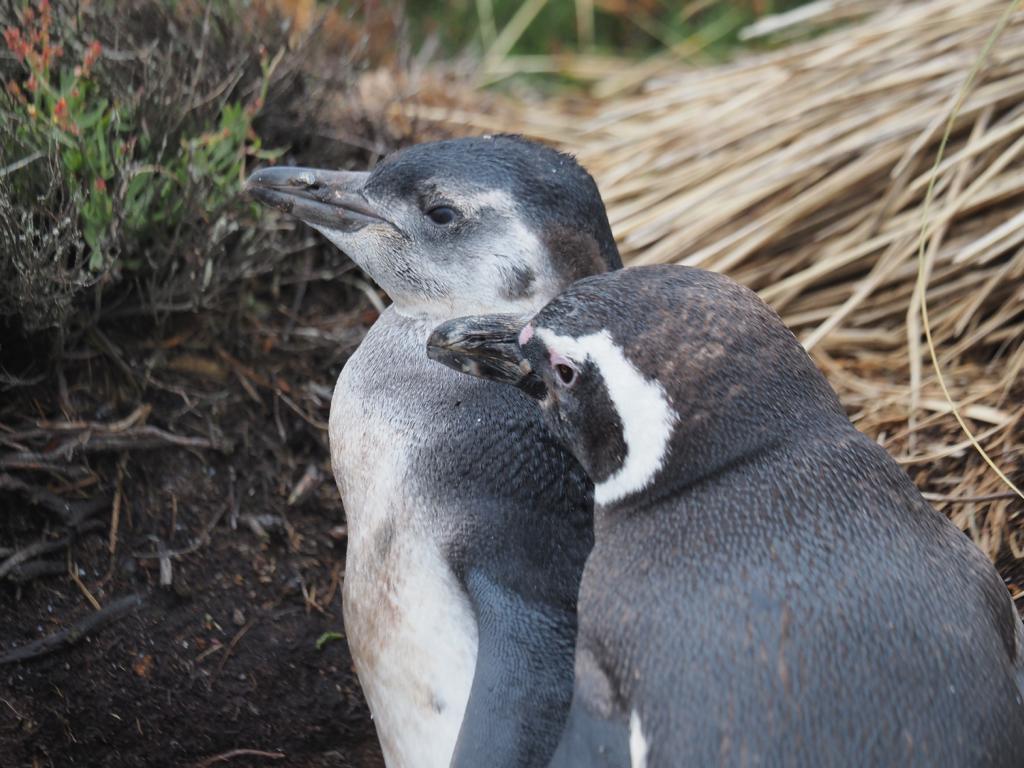 Im Tussock-Gras haben Magellan-Pinguine ihre Bruthöhlen gegraben, die Jungen sind jetzt schon ziemlich gross und haben auch schon fast komplett das Gefieder gewechselt. Meist ist ein Altvogel bei seinen 1 oder 2 Küken und achtet, dass keine Räuber, vor allem unter den Vögeln, diese holen.