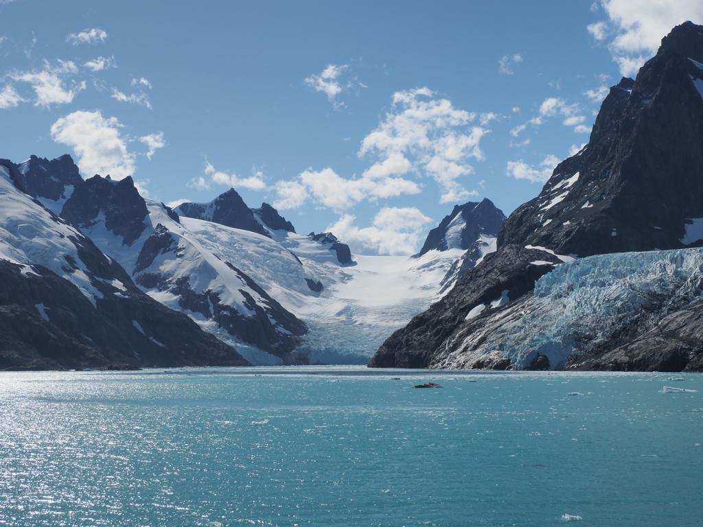 Die Wetterverhältnisse lassen an diesem Tag an der geplanten Stelle keine Anlandung zu; zu stark sind Wind und Seegang, am Sidegate wo wir in die Zodiacs umsteigen sollten gibt es gewaltige Hebungen der Boote gegenüber dem Schiff. Aus diesem Grund fährt die Hanseatic Nature weiter und fährt in den Drygalski-Fjord ein. Dieser erinnert von der Landschaft her an Ostgrönland, hohe, spitze Berge, Gletscher dazwischen, am Ende des Fjord kommt er bis ins Wasser. Dieses ist hier milchig-grün, Gletschermilch eben und wohl auch kaum salzig. Momentan scheint wieder die Sonne und an Deck ist es schön warm. Sobald sich das Schiff am Ende des vermessenen Teils des Fjords dreht und wieder auswärts fährt, gibt es einen kühlen Wind von vorne und es wird schon wieder unangenehm ohne Jacke draussen. Der morgige Tag ist ein Seetag und bringt uns dem Antarktischen Kontinent wieder näher. Noch sind wir bloss auf knapp 55° südlicher Breite, das ist im Norden etwa die Breite von Dänemark!