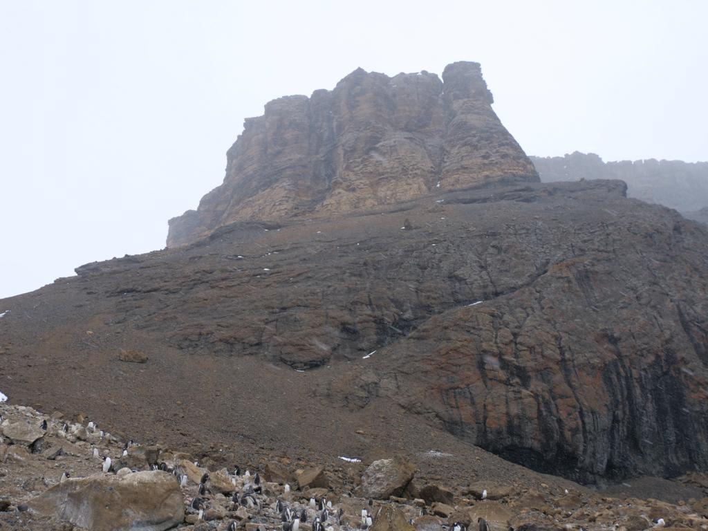 Brown Bluff liegt an der nördlichsten Spitze von Graham Land, der Antarktischen Halbinsel und damit auf dem Kontinent. Wir sind zwar immer noch deutlich ausserhalb des Polarkreises, aber auf beiden Seiten der Anlandestelle münden breite mächtige Gletscher ins Meer. Am Strand liegen grosse Kiesel aus Basaltgestein, es ist etwas mühselig zu gehen.