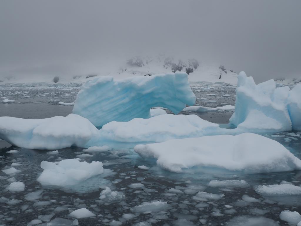 Kokos und Dattelpalmen, weisser Sand und ein blaues Meer vor dem weissen Sandstrand, so stellen sich die meisten wohl eine paradiesische Bucht vor. Die Strände hier sind weiss, weiss vom Schnee und Eis, dazwischen gibt es einige Felsen. Das Wasser ist dunkelblau, fast schwarz und darin treiben grössere Eisberge und viel kleines Brucheis, teilweise weiss, manchmal aber auch schwarz und wenn man näherkommt, sind sie klar wie Glas. Das ist Eis aus der Tiefe des Gletschers. Rund um die Bucht sind hohe felsige Berge mit Eiskappen zu sehen. Leider ist der Himmel heute mehr grau und es regnet zeitweise daraus heraus.