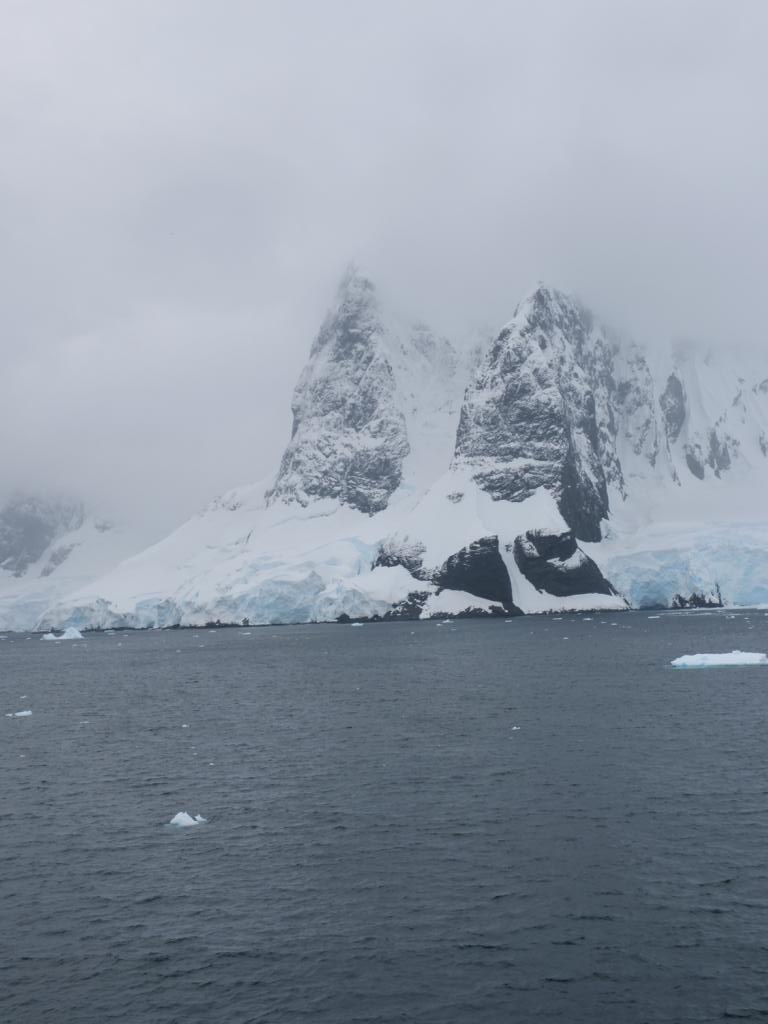Diese enge Passage zwischen der Halbinsel und der Booth Island mit den beidseitig steil aufragenden felsigen Bergen (gegen 1000m hoch) wird als Highlight jeder Antarktisreise in allen Katalogen bezeichnet. Die engste Stelle ist gerade 540m breit und was sich unter Wasser verbirgt sehen wir nicht. Zum Glück gibt es die Seekarten, die das zeigen. Zusätzlich wird die Durchfahrt oft durch Eis erschwert. Wir fahren heute sogar zweimal hindurch, einmal südwärts und ca 5 Stunden später wieder nordwärts. In dieser Zeit ändert sich die Situation mit dem Eis deutlich, Strömungen und Wind bewegen die Eisbrocken. Leider ist es etwas trübe, so sind die Berge nicht ganz zu sehen und bei der zweiten Passage kommt Regen dazu. Am nördlichen Ende gibt es ein Gipfelpaar, das die Phantasie der jungen Männer, die zu den Stationen gefahren sind um meist 2-3 Jahre dort Dienst zu tun, angeregt hat. Sie nannten die beiden Gipfel Una’s tits, heute heissen sie in den Karten politisch korrekt Una’s peaks.