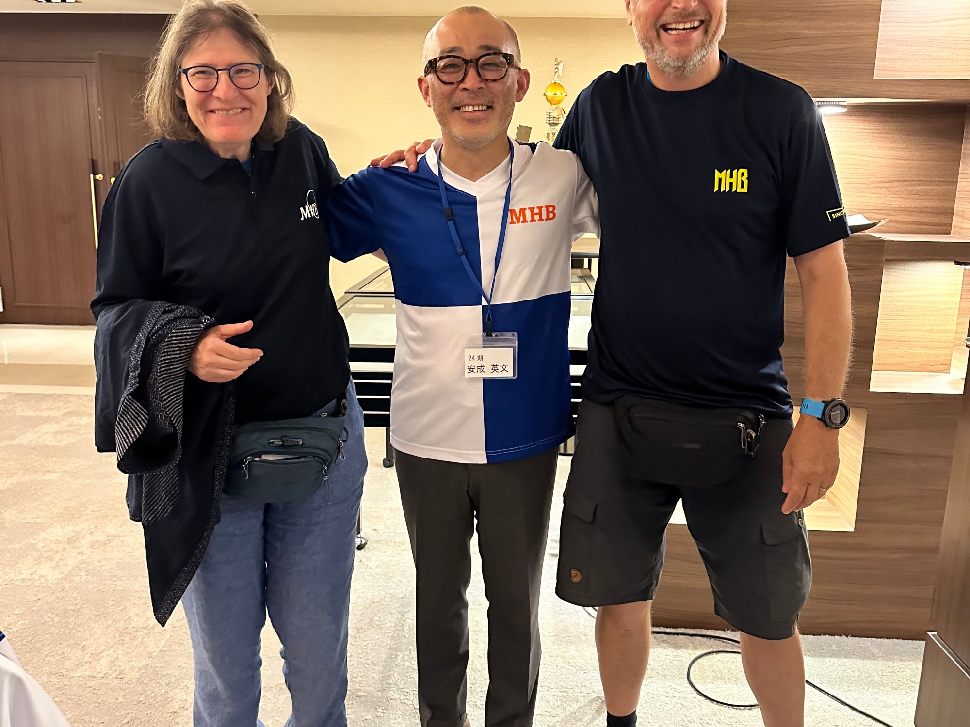 Handball ist in Kumamoto offensichtlich eine grosse Sache, hier hat 2019 die Weltmeisterschaft der Frauen stattgefunden und es gibt eine grosse Halle. Wir können nicht anders und kaufen uns T-Shirts und Poloshirts mit den Zeichen des Klubs. Auch müssen wir mit einem freundlichen Herrn für ein Foto posieren, der (so mein Eindruck) auch eine grosse Persönlichkeit in der Mannschaft gewesen ist. Ashanti glaubt erfahren zu haben, dass der Klub auch japanischer Meister im Handball gewesen ist. Sie freuen sich alle, dass ihre Klubfarben in Zukunft auch in der Schweiz zu sehen sein werden.