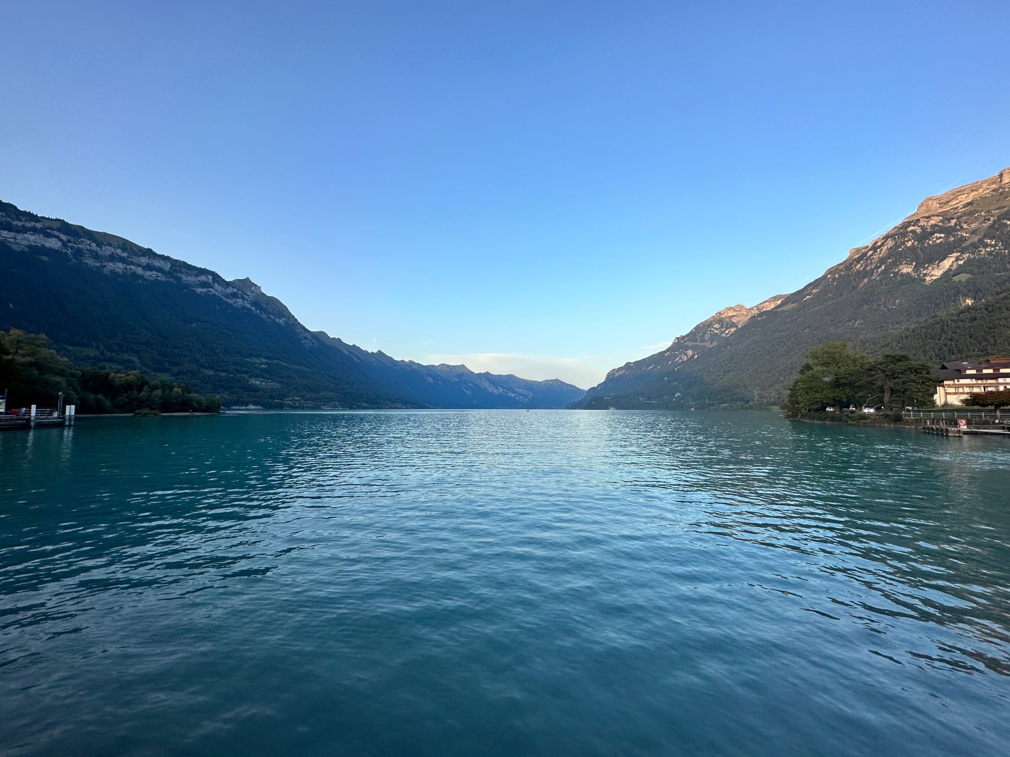 Nach dieser ausgiebigeren Pause nehmen wir wieder Fahrt auf und queren jetzt den See. Der ist an der Stelle fast 2.5km breit. Am anderen Ufer drehen wir nach SW ab und fahren in Ufernähe seeabwärts. Bei einem Campingplatz in Ringgenberg legen wir noch einmal an um uns die Arme etwas auszuschütteln und abzukühlen. Der letzte „Leg“ führt uns danach praktisch auf der Luftlinie wieder zum Ausgangspunkt zurück. Am Ende haben wir etwa 16km auf dem Wasser zurückgelegt, oder wie der Nautiker sagt, knapp 9 Meilen (8.89Nm). Dies mit immerhin einer durchschnittlichen Geschwindigkeit von gut 3kn.