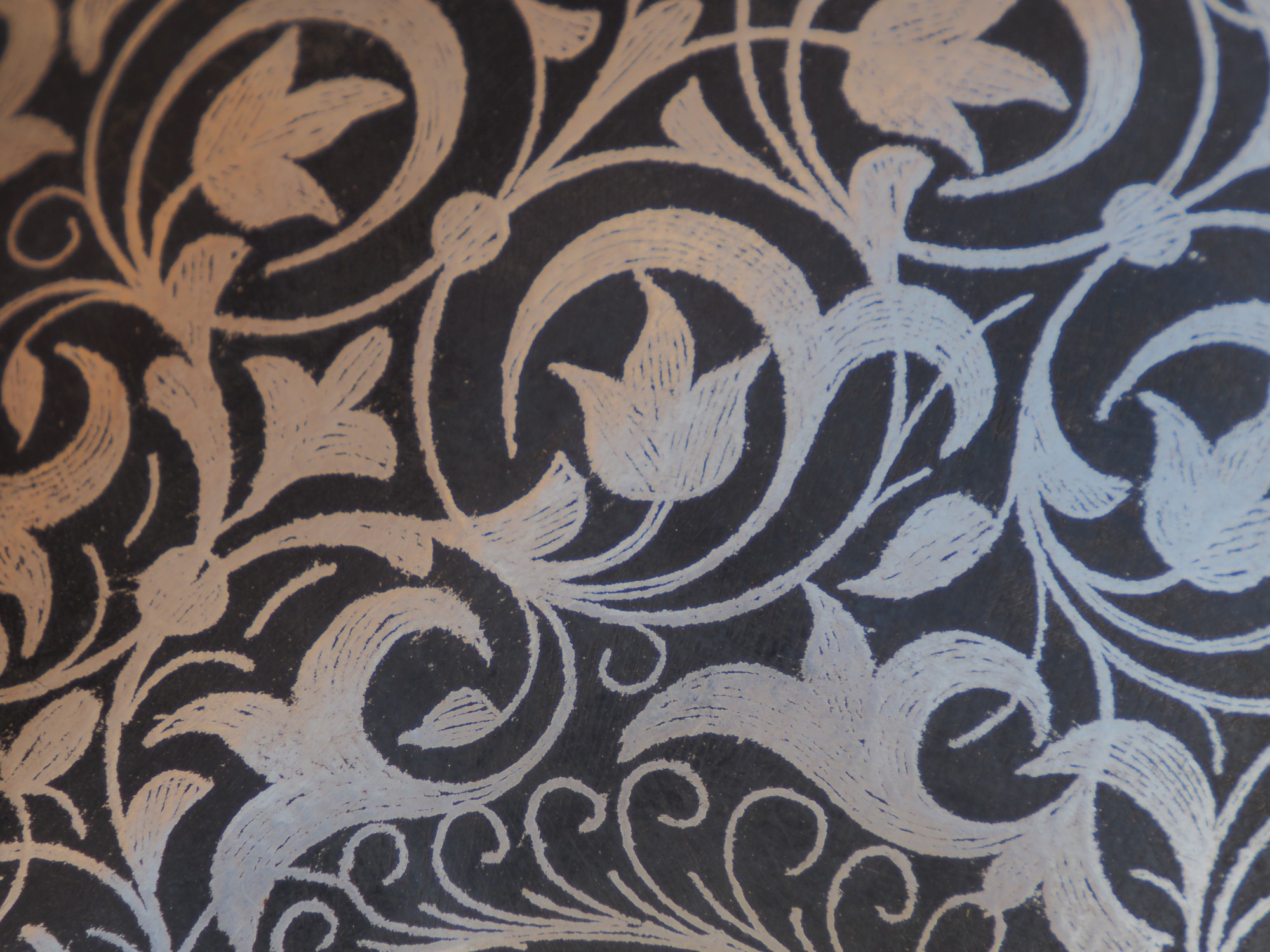 Du weisst nicht, was das ist? Damscine ist eine Kunst, die aus Damaskus stammt. Hier werden auf Stahl-Produkte, die aufgerauht sind, mittels eines feinen Silberfadens Ornamente und Muster auf gehämmert, der Faden auf den Stahl gehämmert und damit Linien gezeichnet. In verschiedenen Erhitzungsvorgängen wird das Silber mit dem Eisen legiert, poliert und danach das Ganze nach erneutem Erhitzen in (Pflanzen-)Öl brüniert. Damit wird die Oberfläche sehr korrosionsbeständig und dunkel gefärbt, bis auf die silberfarbenen Linien darauf.