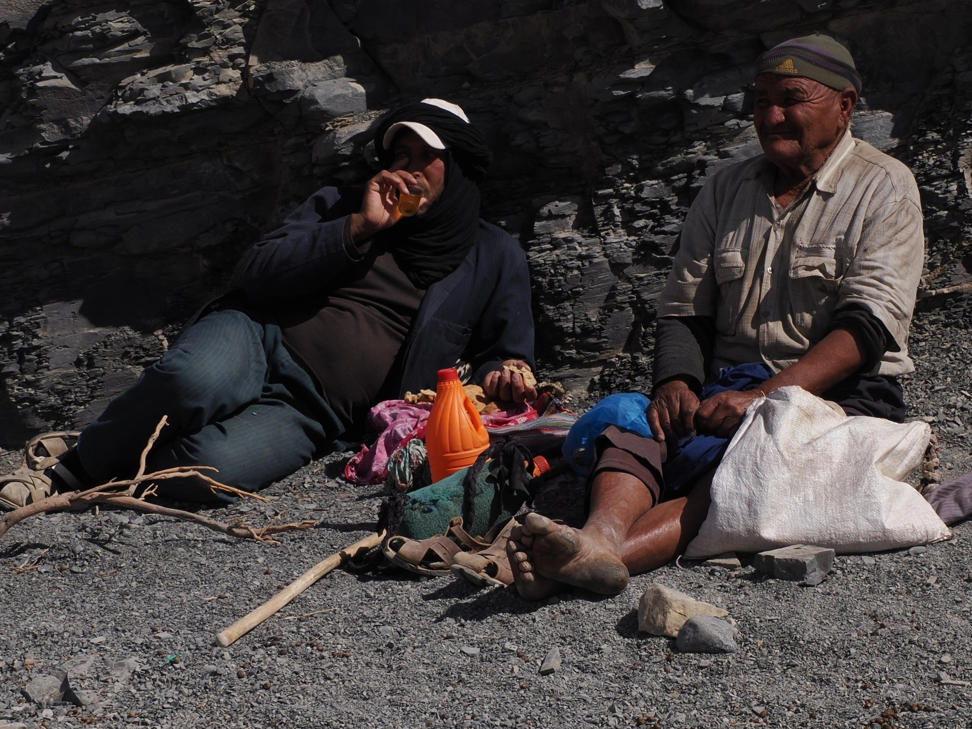 Bei Amellagou geht es dann in eine recht enge Schlucht. Hier fliesst aber Wasser an der Oberfläche und die kleinen Felder im Talboden sind saftig grün. Einzelne Männer bearbeiten ihre Felder von Hand mit kleinen Hacken. Bei einem Dorf Namens Imider nehmen wir unser Picknick an Fluss. Wir müssen eine steile, halb zerfallene Treppe hinabsteigen zum Fluss. Zuvor müssen wir uns durch eine Schar Kinder kämpfen, die durch kleine Geschenke angelockt wurden. Es werden immer mehr. Martin sagt uns später, dass wir Geschenke erst verteilen sollten, bevor wir von so einem Ort wieder abfahren. So haben wir anfänglich eine grosse Schar Kinder, die uns beim Essen zusehen, zwar mit Abstand, aber irgendwie ist es trotzdem unangenehm. Später kommen allerdings Erwachsene, und rufen die Kinder weg.