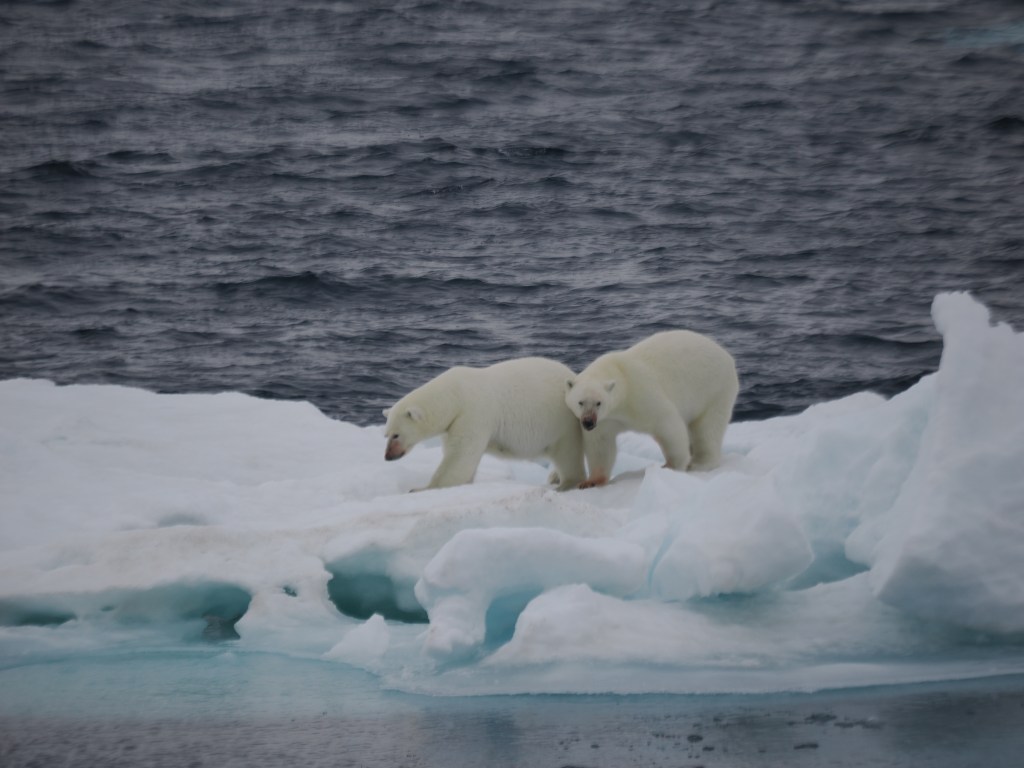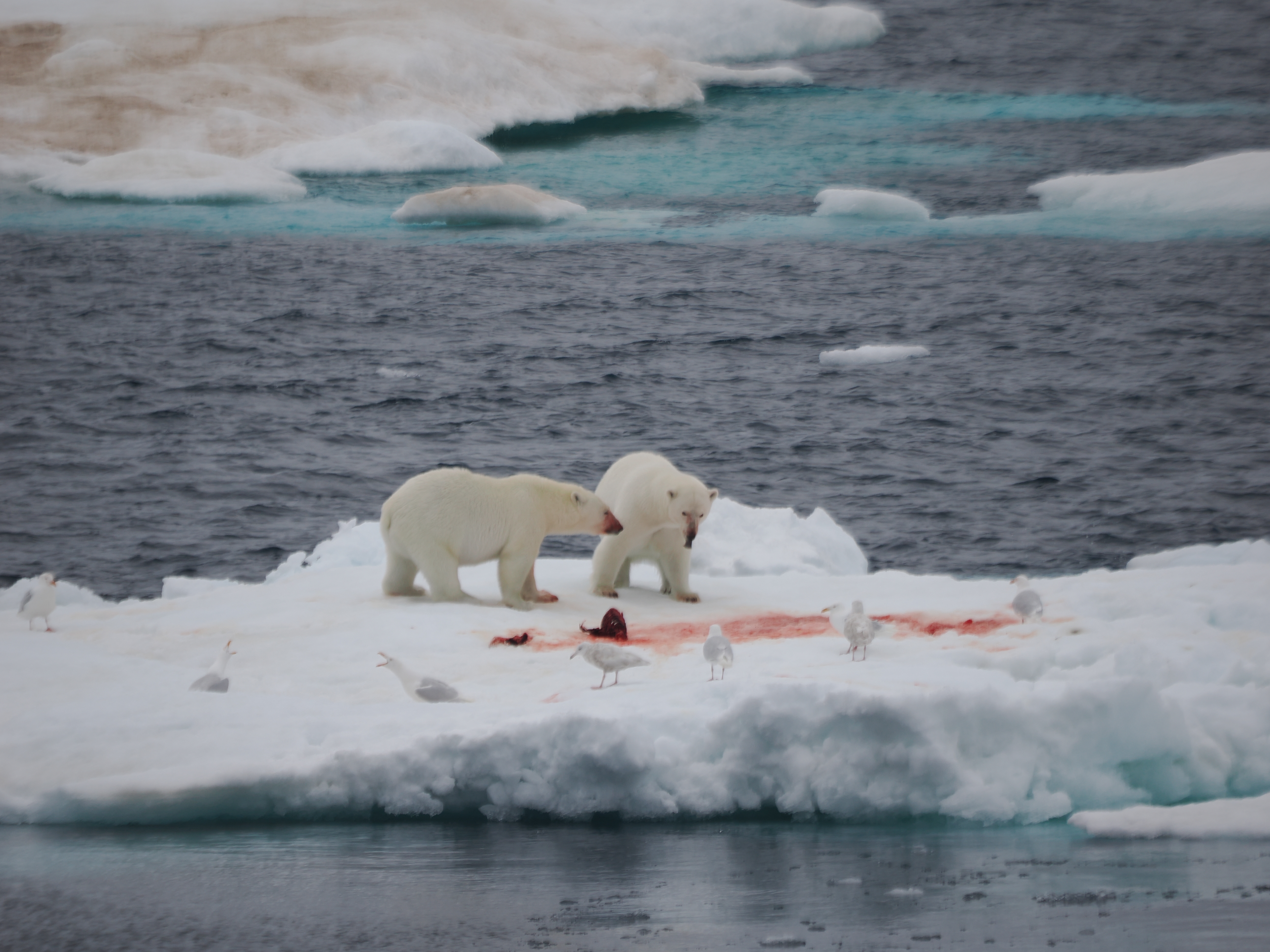 Nur kurze Zeit später werden wieder Bären gesichtet, diesmal sind es zwei. Diese haben offensichtlich am Morgen eine Robbe jagen können und fressen nun friedlich an dieser. Es müssen wohl Geschwister sein, ungefähr 2 Jahre und 9 Monate alt. Sie sind friedlich beisammen und fressen ohne Stress an dieser nicht übermässig grossen Beute. Manchmal stubsen sie sich friedlich an, was nicht der Fall wäre, wenn es eine zufällige Begegnung wäre. Hinweise deuten darauf hin, dass es ein Junge und ein Mädchen sind, was aber nicht sicher zu bestimmen ist.