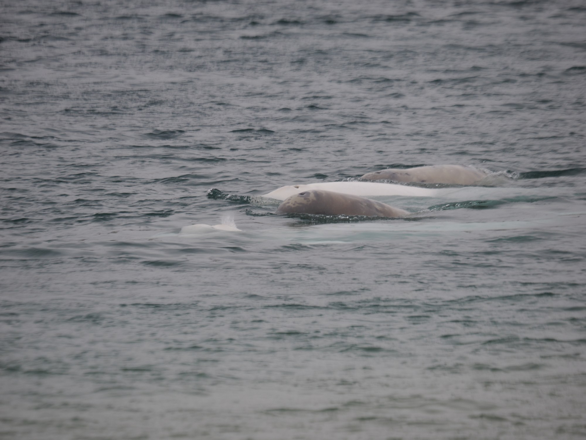 Heute hatten wir die seltene Möglichkeit, Belugas in einer Buch sehen zu können. Interessanterweise schwammen sie fast immer nahe am Ufer entlang und tauchten auch häufig auf, so dass man sie atmen hören konnte. Auch Kälber waren dabei; diese sind dunkler, eigentlich grau gefärbt.