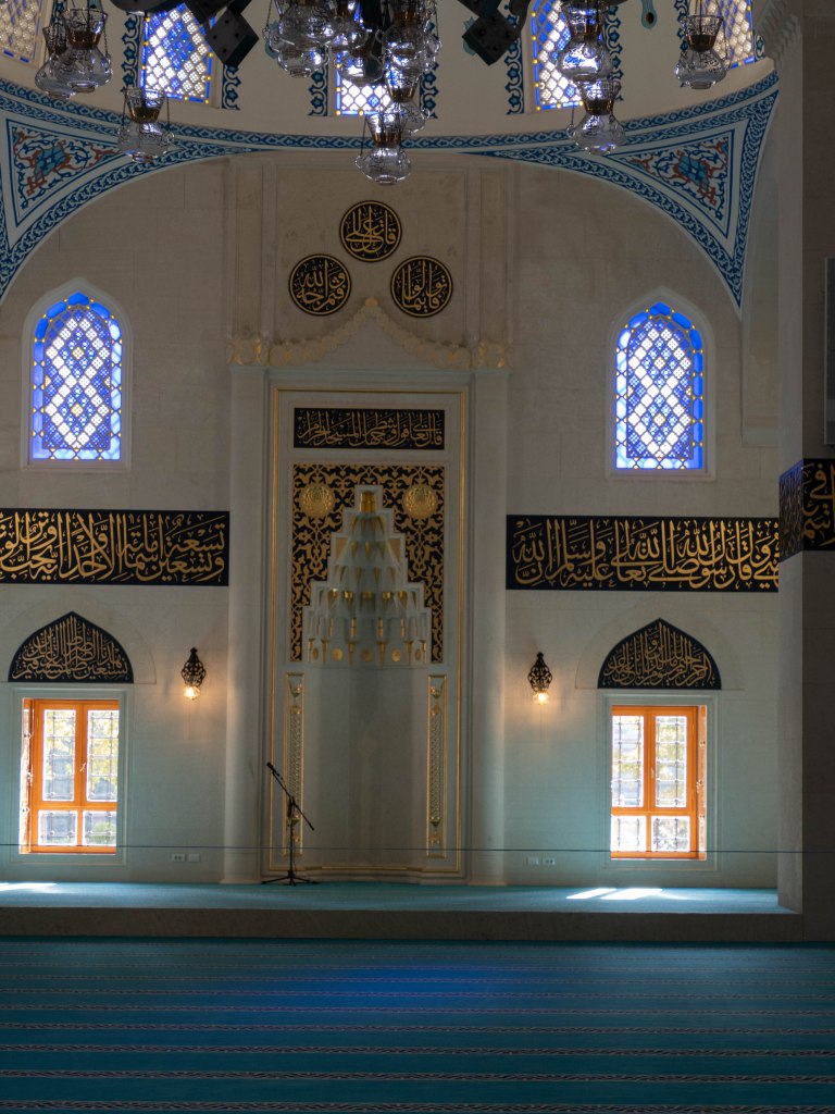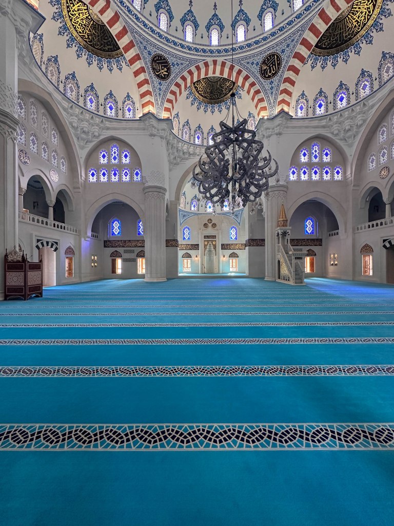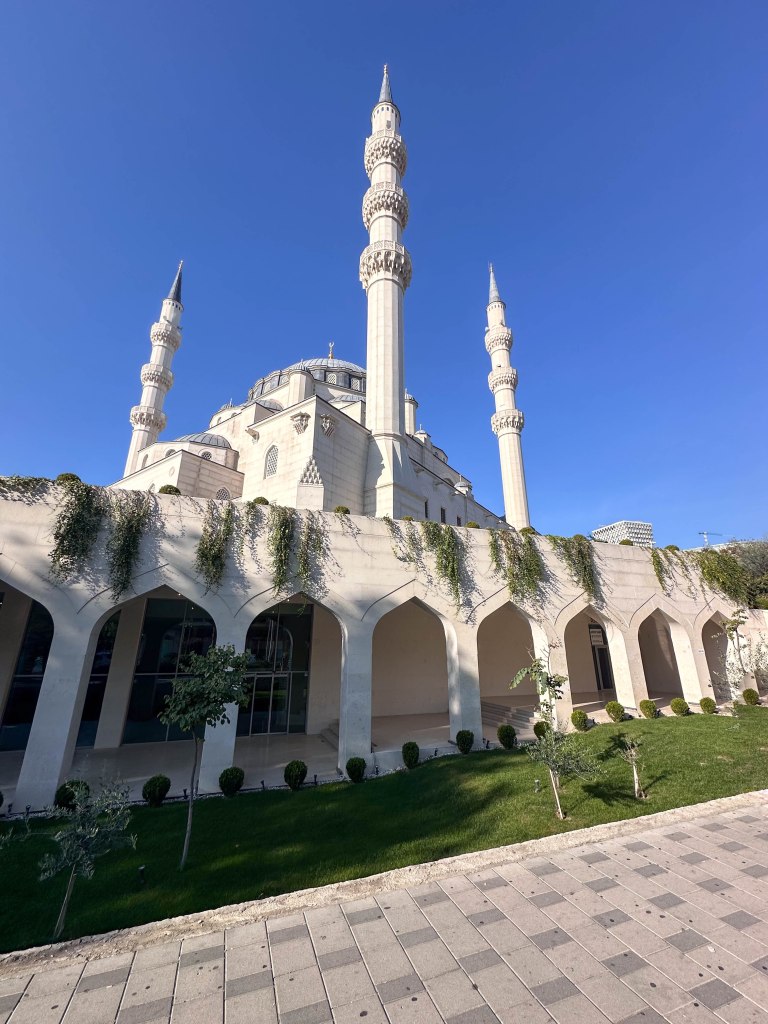 Vom Bild erinnert der Bau an die blaue Moschee in Istanbul, nur dass diese sogar 6 Minarette aufweist. Eine mächtige Kuppel ist von weit herum sichtbar und wird von den 4 Minaretten umrahmt. Strahlendes Weiss nach aussen bestimmt die Fassade, innen sind viele arabische Zeichen zu sehen. Zur Grundsteinlegung und zur Eröffnung ist der türkische Präsident angereist. Vielleicht gibt es auch Träume von einer Wiedergeburt des Osmanischen Reiches unter seiner Führung…